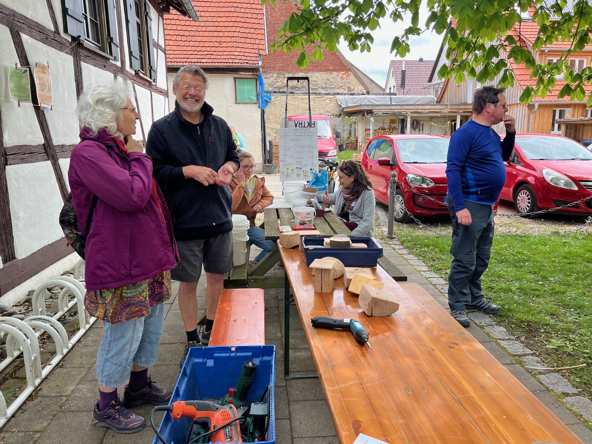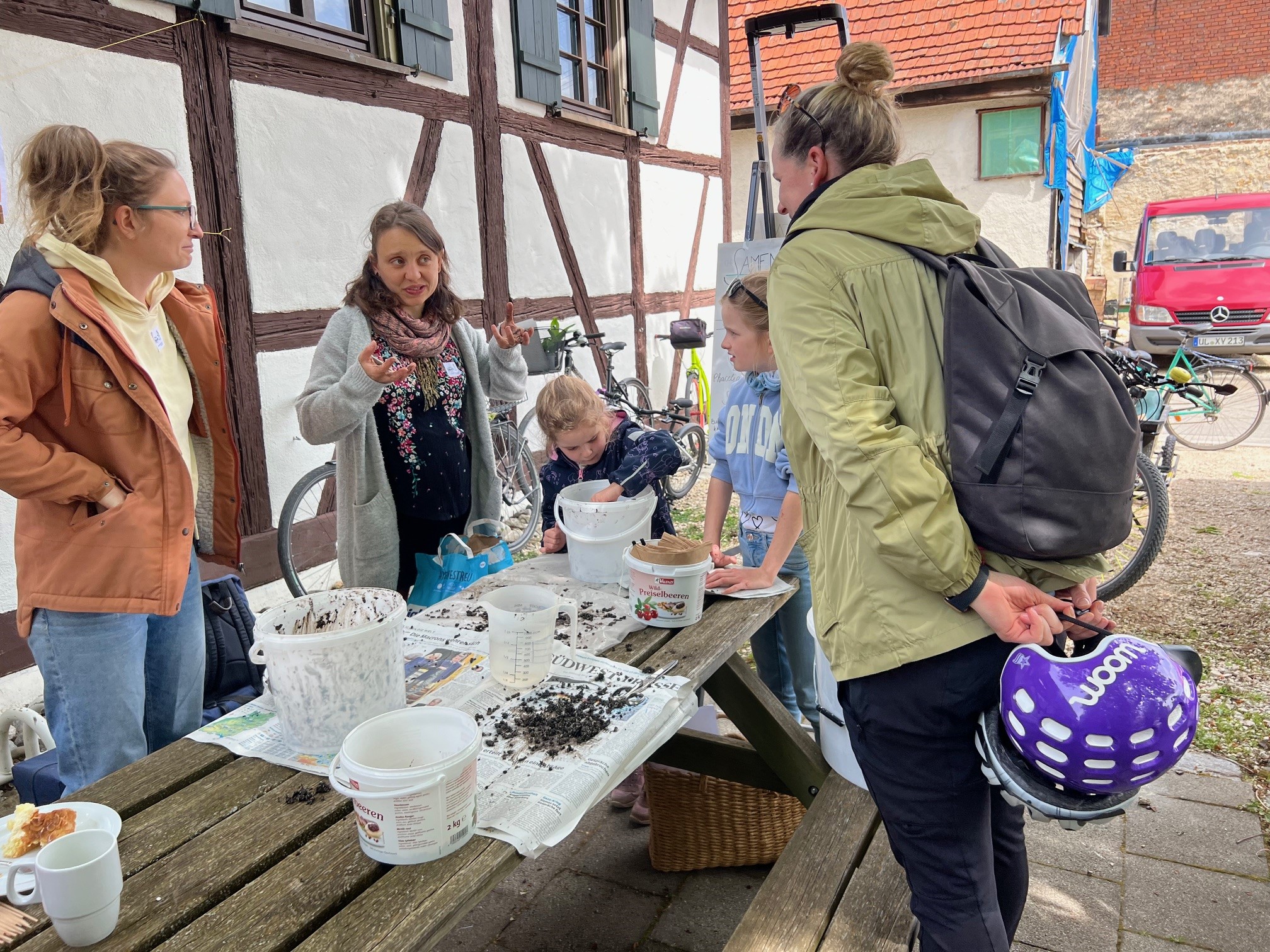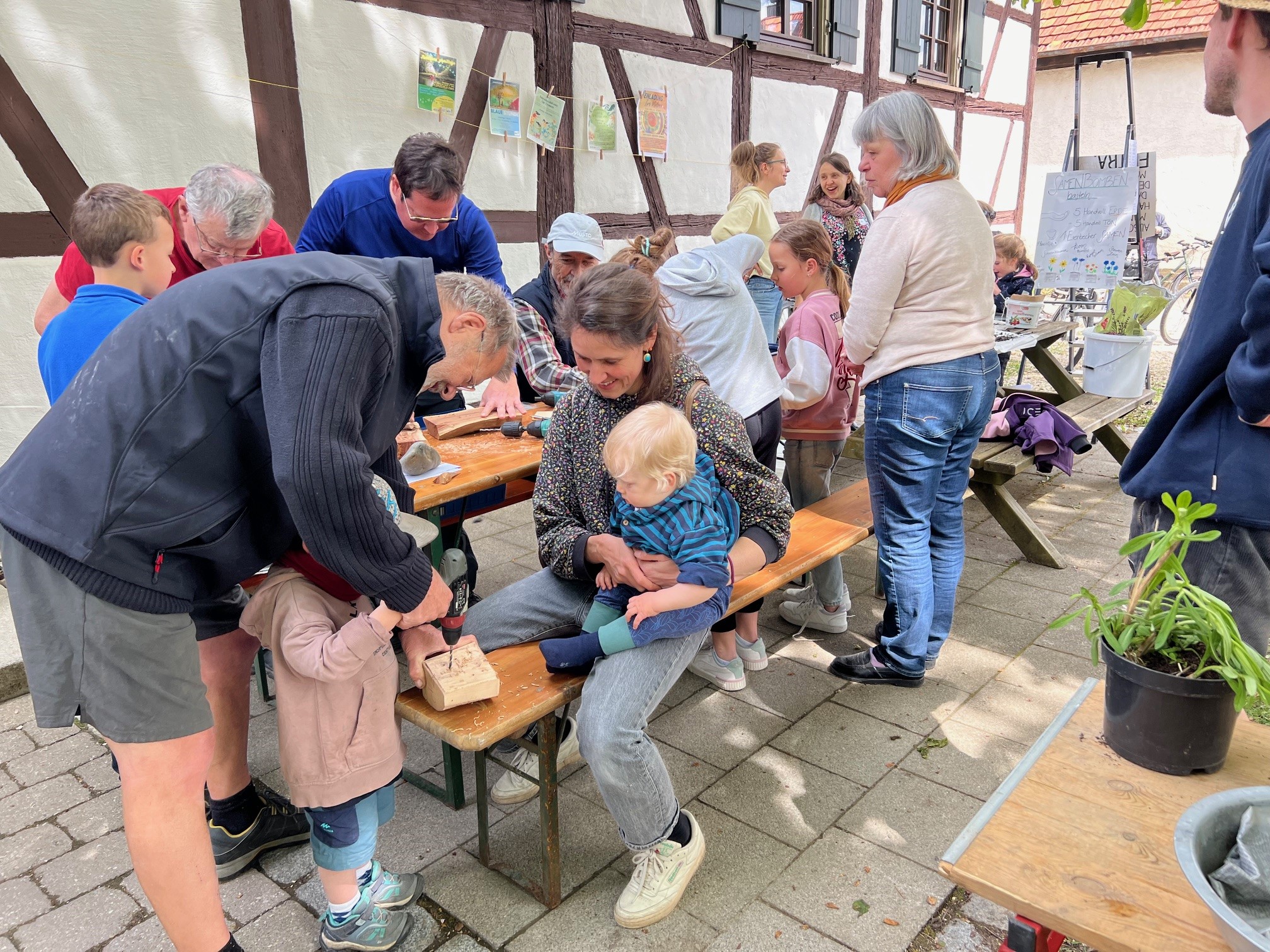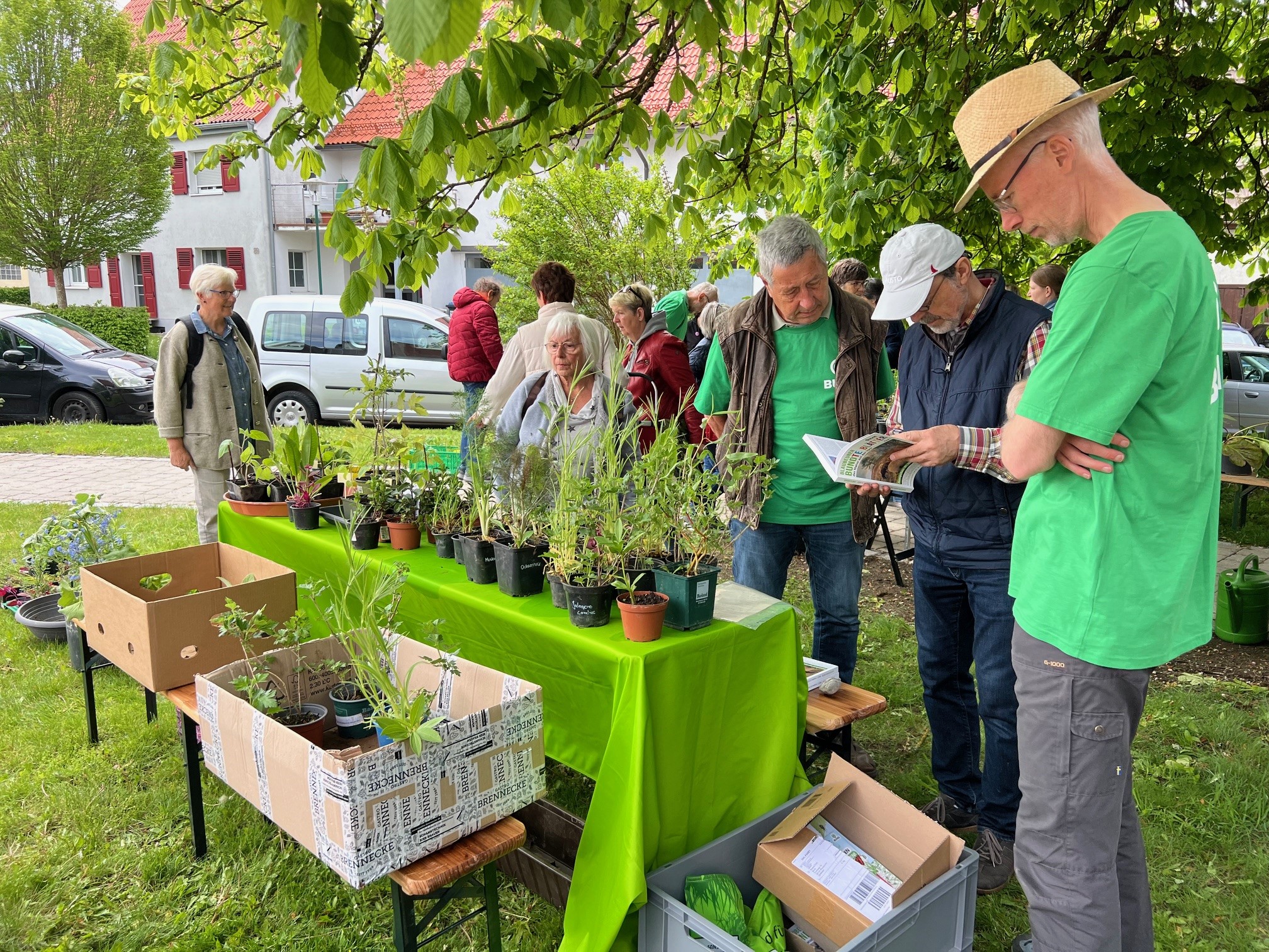 Zusammen mit dem BUND, dem Blauen Wunder eV Blaubeuren und den Landfrauen konnten wir zahlreiche grosse und kleine Besucher auf der Pflanzentauschbörse begrüssen. Es wurde fleissig geteilt, getauscht, getratscht und neue Kontakte geknüpft. Und natürlich wurde gebastelt: gebohrt, gemalt und gestanzt — Samenbollen mit dem Blauen Wunder, Nisthilfen mit dem Albverein und Schmetterlinge mit dem BUND. Die leckeren Kuchen samt Bienenstich von den Backprofis der Landfrauen und des Albvereins waren wie letztes Jahr in kürzester Zeit ausverkauft!