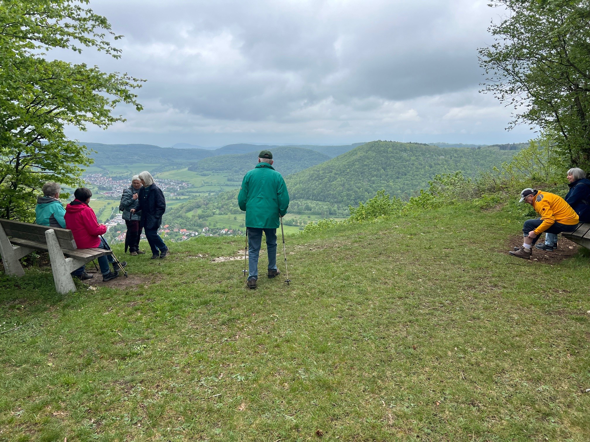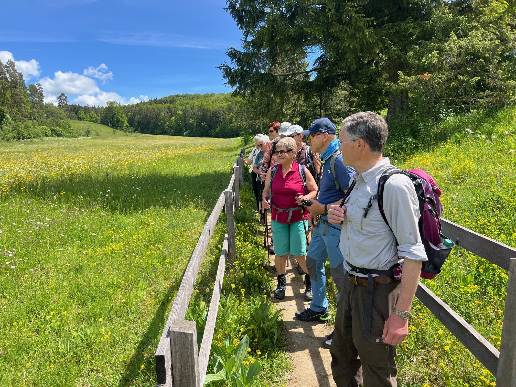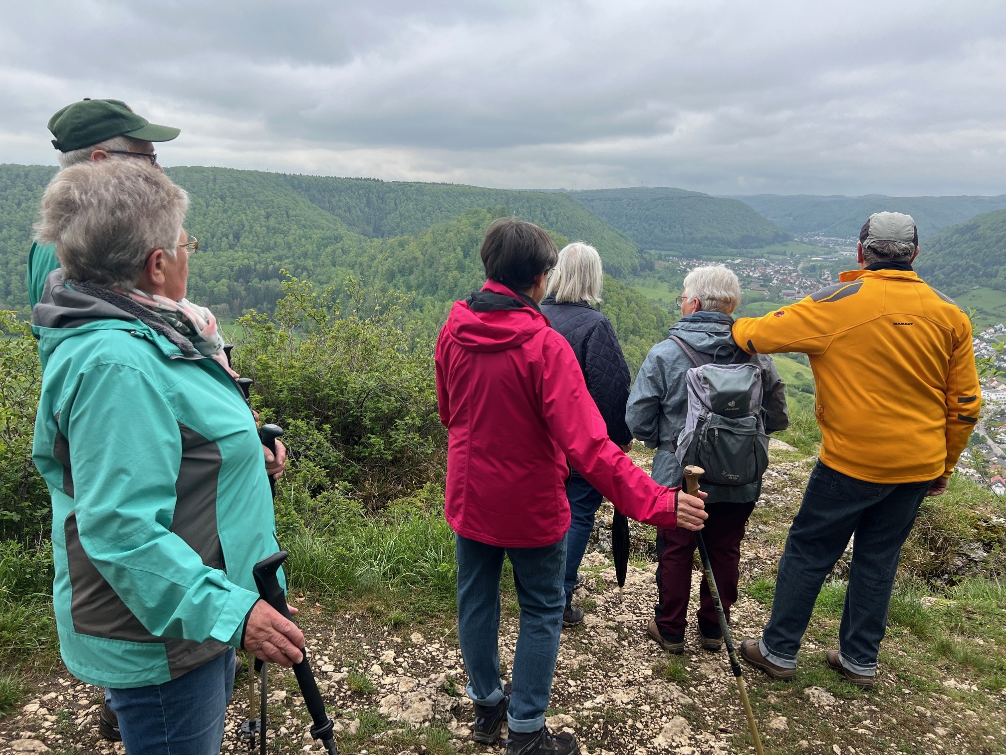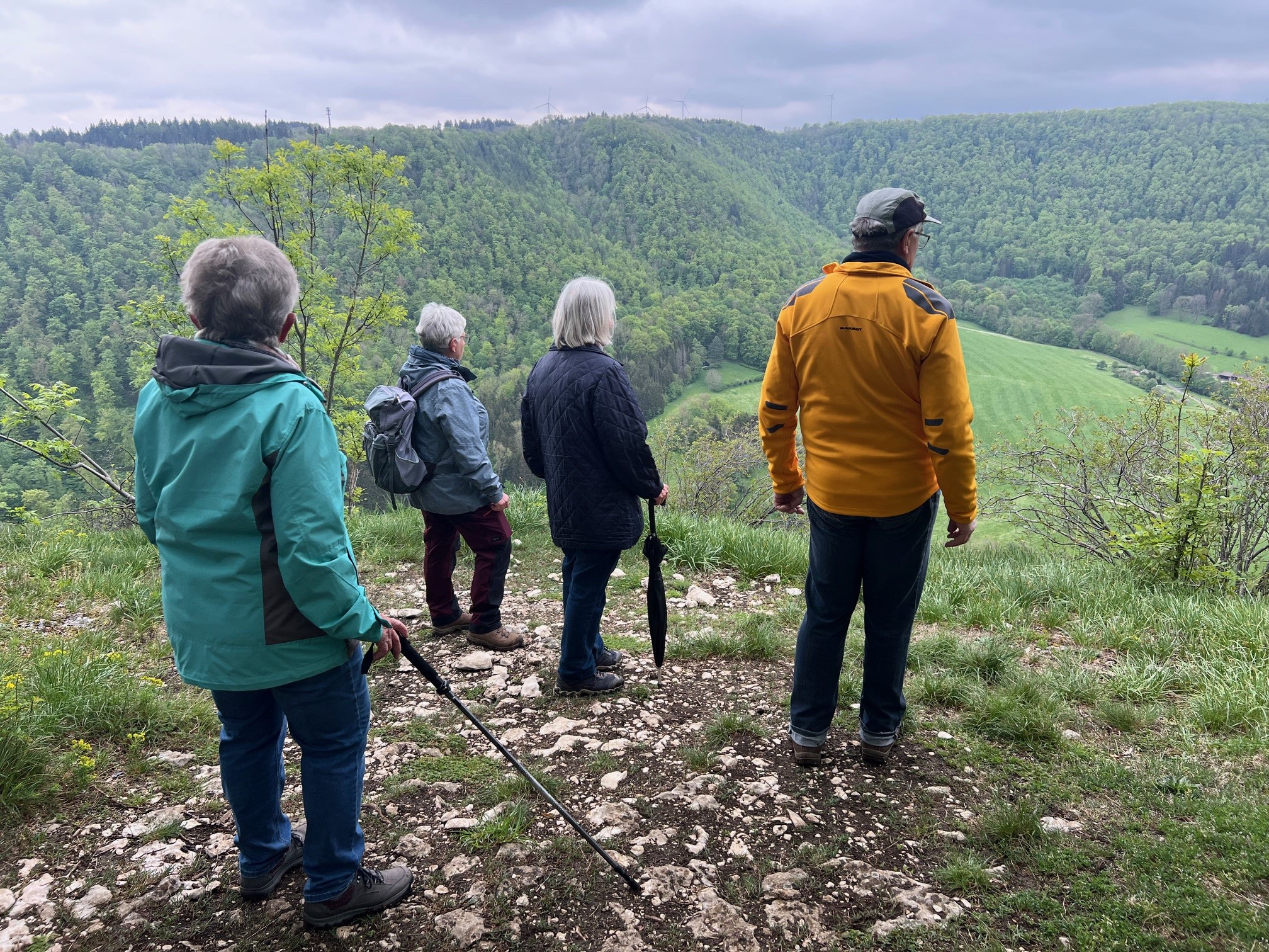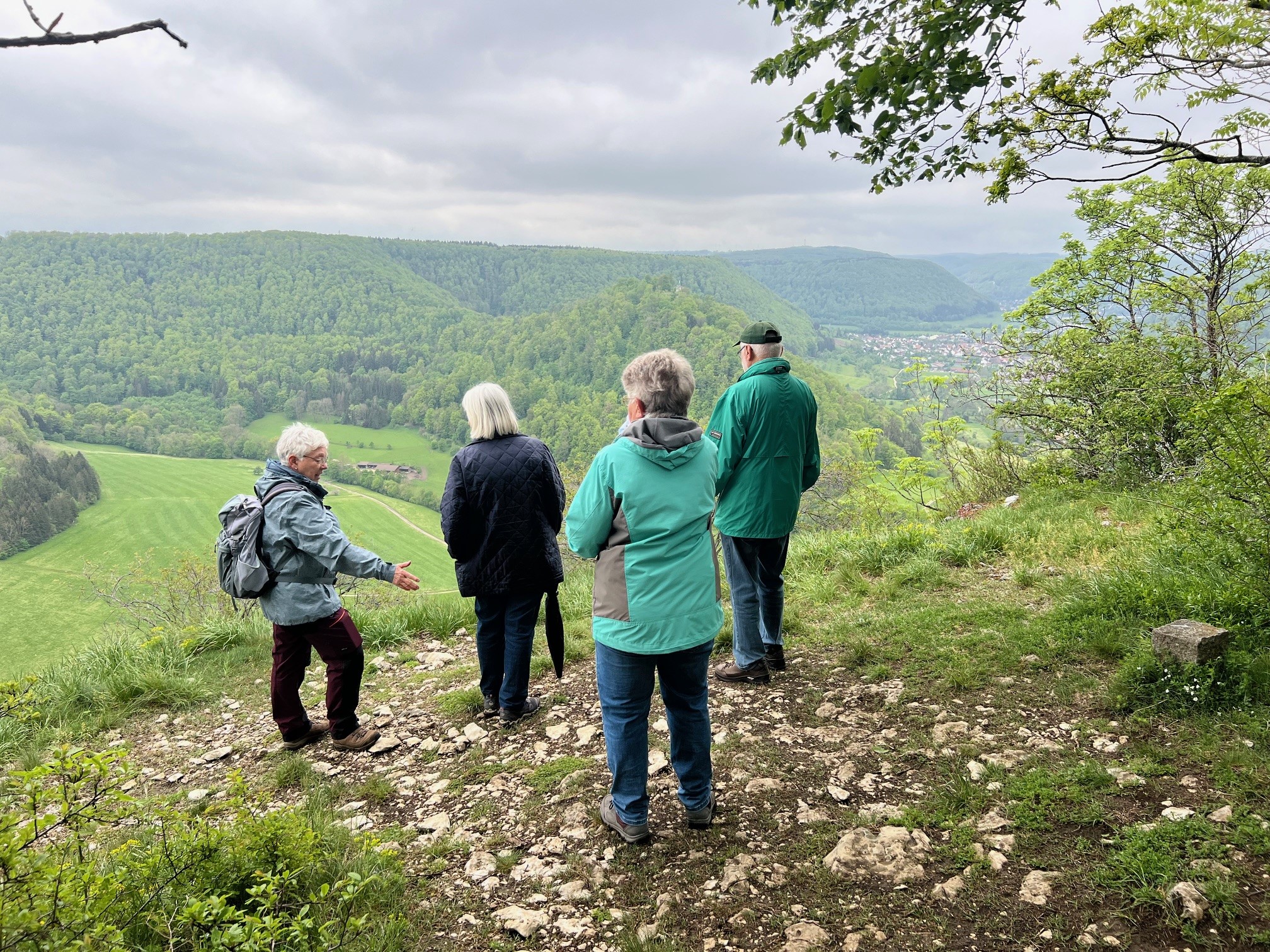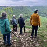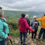 Tiefhängende Wolken, drohender Regen, kühl, aber trotzdem nehmen 8 Unerschrockene teil – das ist Einsatz :-). Und wir haben Glück: es regnet nicht, der Wurzelweg am Trauf entlang von der Schonterhöhe bis zur ehemaligen Burg Berneck lässt sich gut laufen und die Knabenkräuter blühen lila, rosa und gelb im Übermass. Ausserdem jede Menge beinah blühende Türkenbundlilien, Salomonsiegel, ährige Teufelskralle und immer noch viele Schlüsselblumen. Trotz oder wegen der tiefhängenden Wolken beinahe dramatische Aus- und Einblicke ins Filstal, ein kurzer spiritueller Stop an der Buschelkapelle und schon dürfen wir die Belohnung für die 4 Wanderkilometer im urigen Gasthaus Berneck geniessen : Kirsch/Nusskuchen, extra für die OG Seissen gebacken. Wanderherz, was willst du mehr. Danke an alle wetterfesten Teilnehmer!