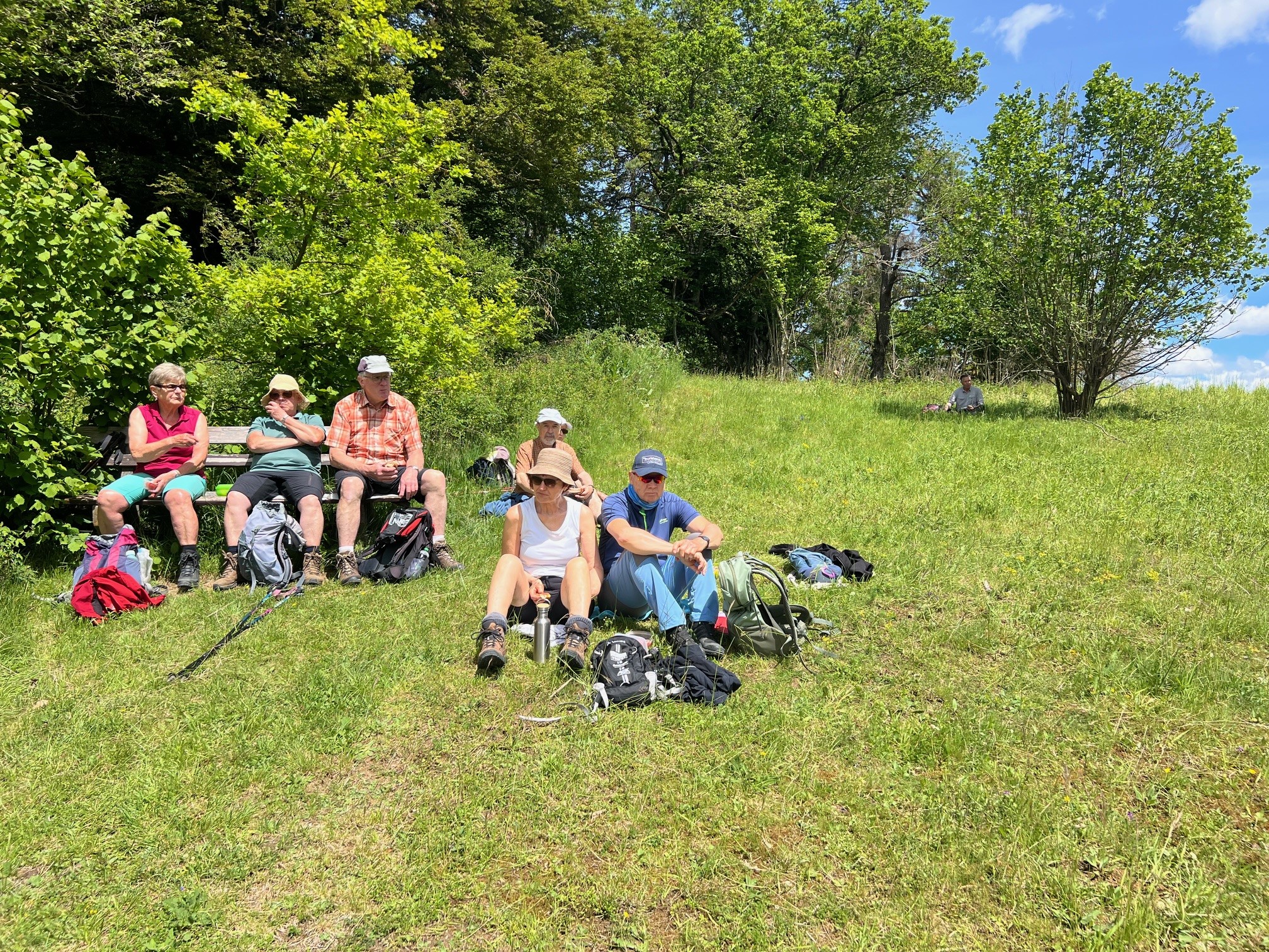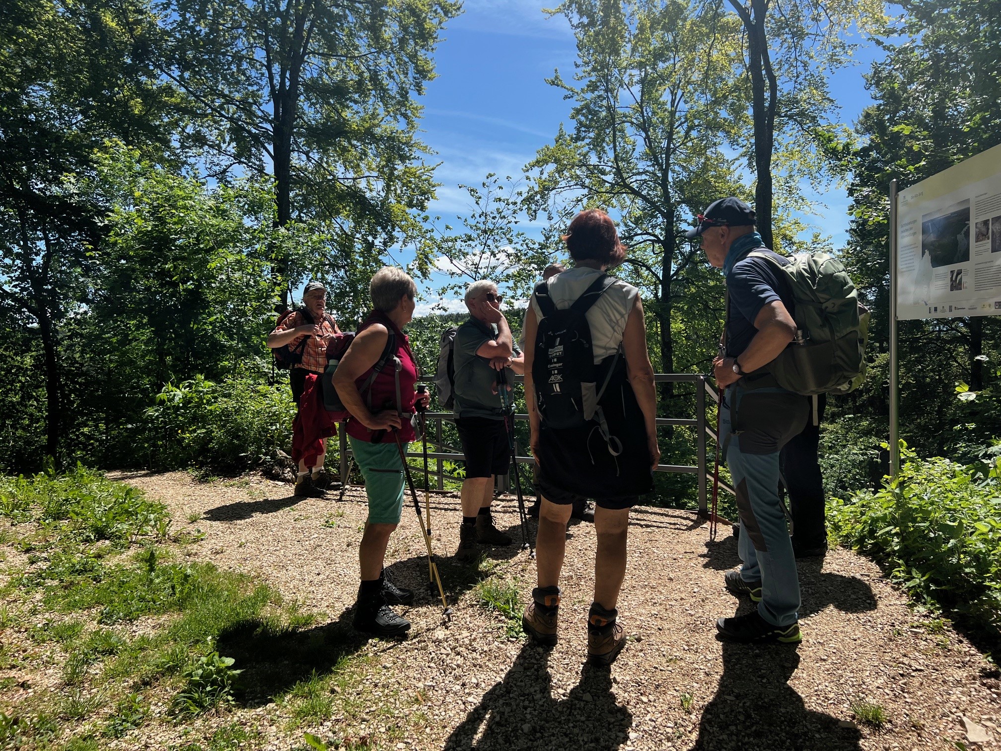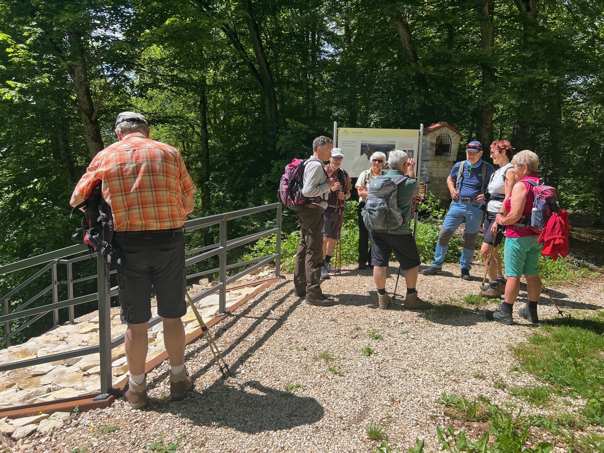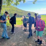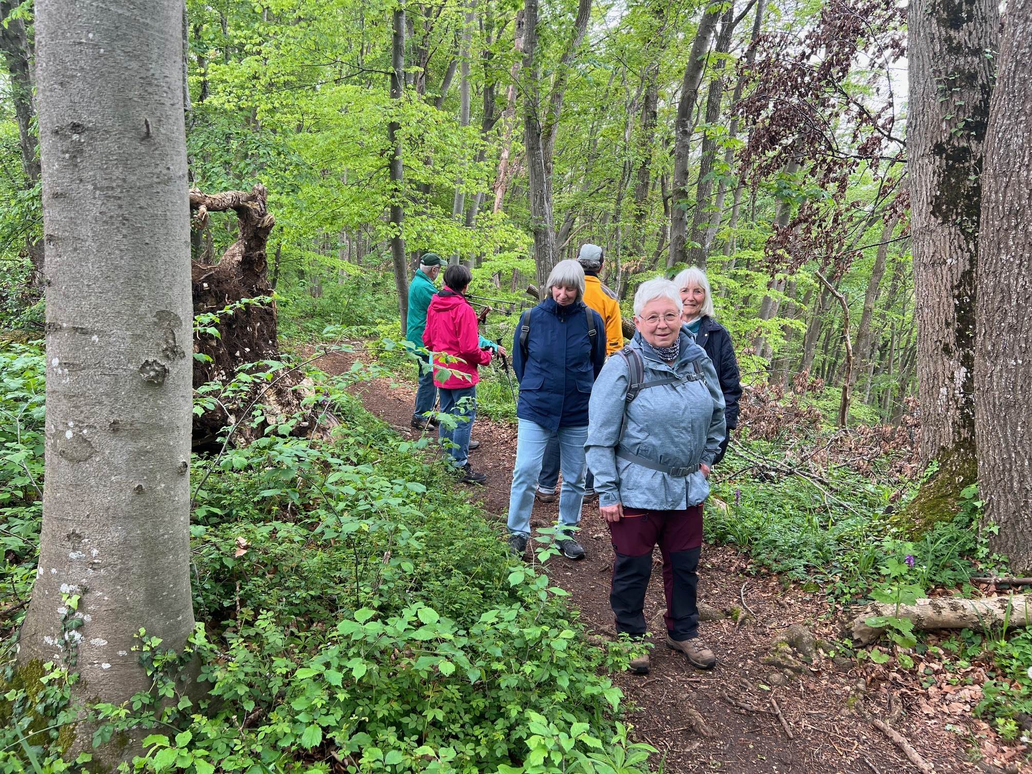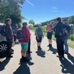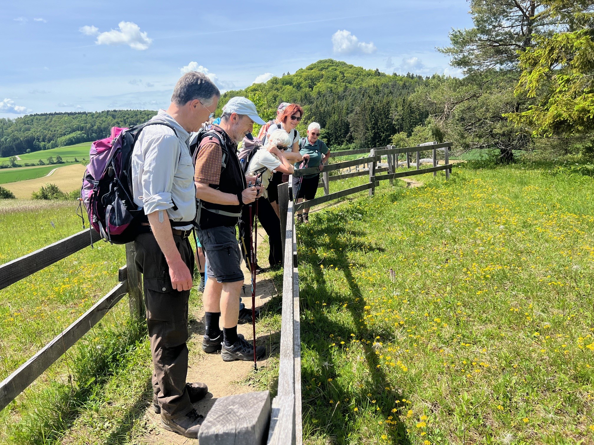 Tiefhängende Wolken, drohender Regen, kühl, aber trotzdem nehmen 8 Unerschrockene teil – das ist Einsatz :-). Und wir haben Glück: es regnet nicht, der Wurzelweg am Trauf entlang von der Schonterhöhe bis zur ehemaligen Burg Berneck lässt sich gut laufen und die Knabenkräuter blühen lila, rosa und gelb im Übermass. Ausserdem jede Menge beinah blühende Türkenbundlilien, Salomonsiegel, ährige Teufelskralle und immer noch viele Schlüsselblumen. Trotz oder wegen der tiefhängenden Wolken beinahe dramatische Aus- und Einblicke ins Filstal, ein kurzer spiritueller Stop an der Buschelkapelle und schon dürfen wir die Belohnung für die 4 Wanderkilometer im urigen Gasthaus Berneck geniessen : Kirsch/Nusskuchen, extra für die OG Seissen gebacken. Wanderherz, was willst du mehr. Danke an alle wetterfesten Teilnehmer!