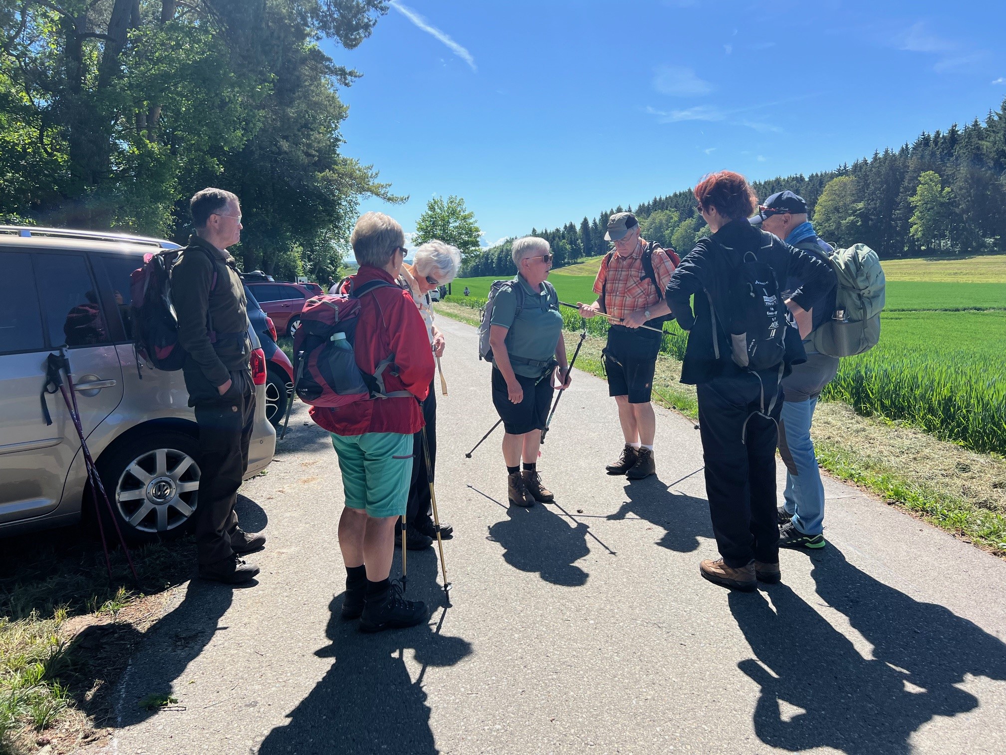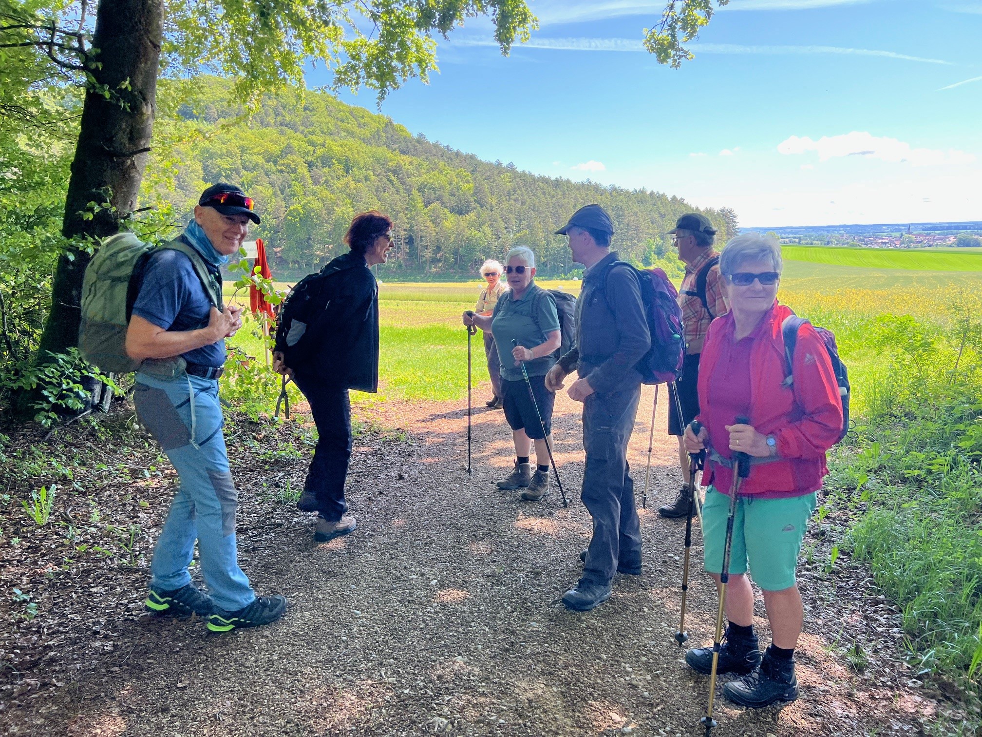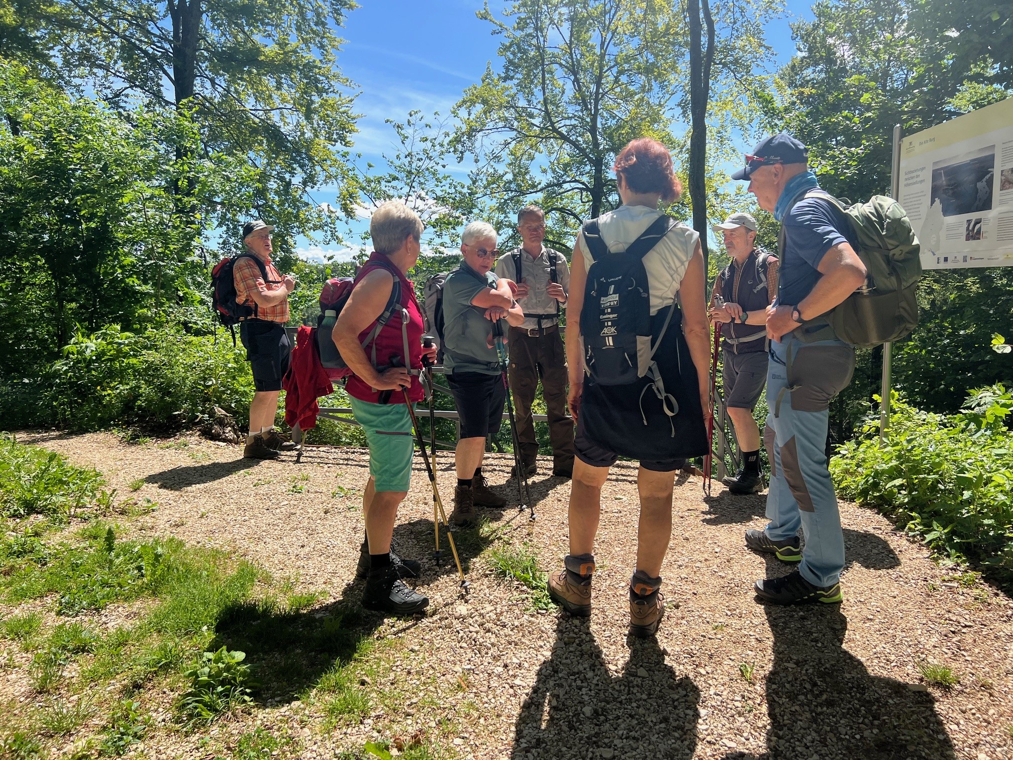 Bei herrlichstem Wetter machen sich 9 Wanderer auf ins Warmtal, die dortige berühmte Frauenschuhblüte zu bewundern. Und wir werden nicht enttäuscht, glücklicherweise rechtzeitig die Hauptblütezeit erwischt, dürfen wir prächtig in Vollblüte stehenden Frauenschuh an viele lichten Waldstellen sehen. Beim Aufstieg zur alten Burg begleiten uns Immenblatt, Akelei, und die ’schöne Frau‘ als sehr wirksamer Inhaltsstoff der Tollkirsche (Belladonna, Atropin). Die Plattform und der Wall der Keltenburg von ca 600 a.D. lassen die Arbeit nur ahnen, die das Errichten damals gekostet hat. Interessant die Hintergründe zur Sichtachsenverbindung zur Grossen und Kleinen Heuneburg. Auf den Lohrmannsbuckel mit seinem sehr mageren Kalkmergelboden und der daher rührenden sehr hohen Vielfalt an Orchideen und anderen seltenen Pflanzen führt ein streng abgezäunter Weg durch das Naturschutzgebiet. Purpur-Orchidee, Brand-Orchidee, Fliegen-Ragwurz, Helmkraut, gerade erblühender gelber Enzian, Teufelskralle und viele Blümchen mehr lassen uns aus dem Fotografieren nicht mehr herauskommen. Nach der Brotzeit geht es weiter durch wellige, liebliche Hügellandschaft, Wald und Feld vorbei an herrlichen Blumenwiesen mit Skabiosen, Bocksbart, Esparsetten, Margeritten, mehrblütigen Glockenblumen, Ehrenpreis um nur ein paar zu nennen — bunte Wiesen, wie wir sie bei uns nur noch aus der Kindheit kennen. Nach ca. 11 km und 200 hm runden Kaffee, Eis und Kuchen auf der Terrasse des Gasthof Adler in Obermarchtal die harmonische Wanderung ab.