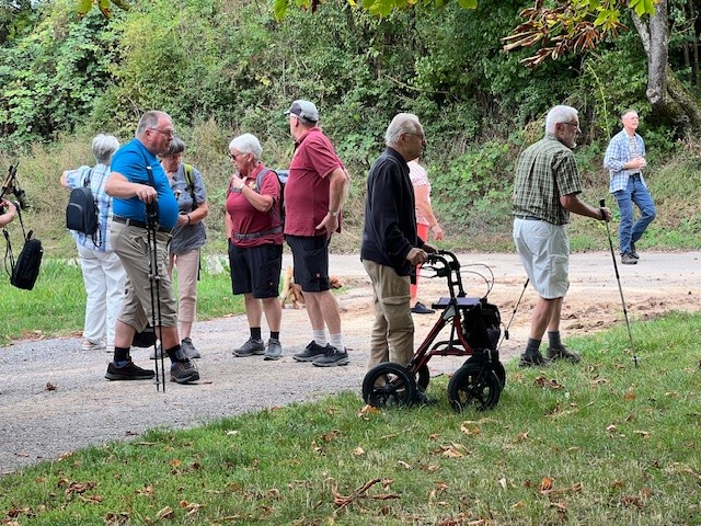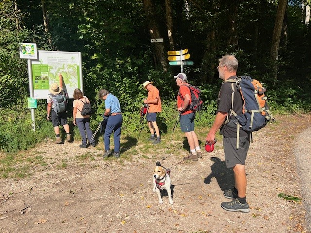 Das Wirtshaus zum Butzental war Start-, Ziel- und Einkehrpunkt der Hochsträßwanderung. Der starke Ostwind hatte die letzten Regenwolken vom Vortag vertrieben und so zogen 10 Wanderer und Fred los zu einer gemütlichen Frühherbstwanderung bei milden Temperaturen. Schon kurz nach dem Wirtshaus ging es auf schmalem und steinigem Pfad hinauf aufs Hochsträß, wo der Blick weit übers Donautal reichte. Nach Osten vorbei an der KZ-Gedenkstätte mit Blick zum Ulmer Münster war schon bald der tertiäre Quellhorizont erreicht. Der Pfad schlängelte sich recht feucht durch herbstlichen Mischwald bis zur Schlußeinkehr im Wirtshaus zum Butzental. Schön, dass so viele die 5.5 km mitgelaufen sind!