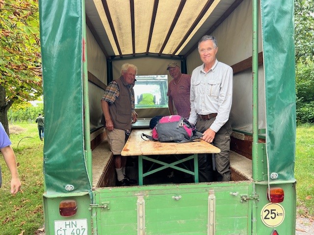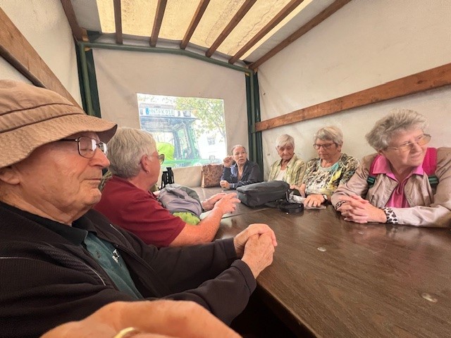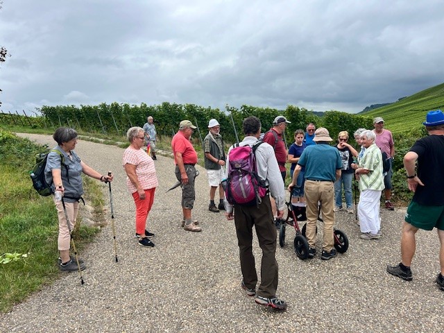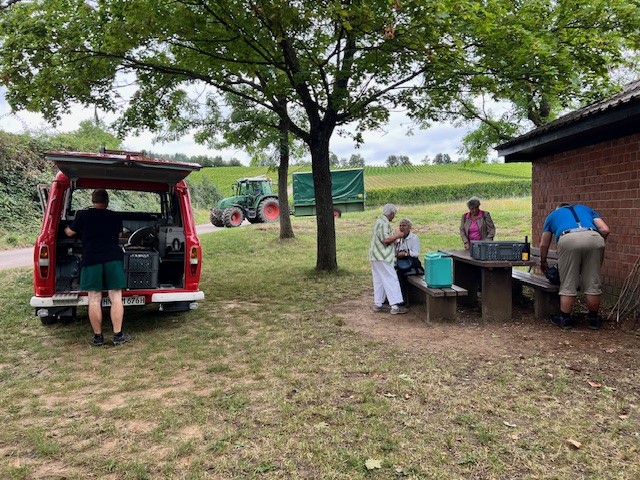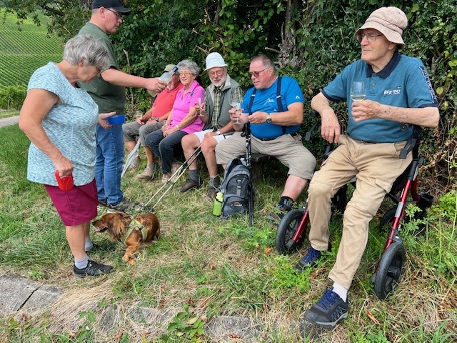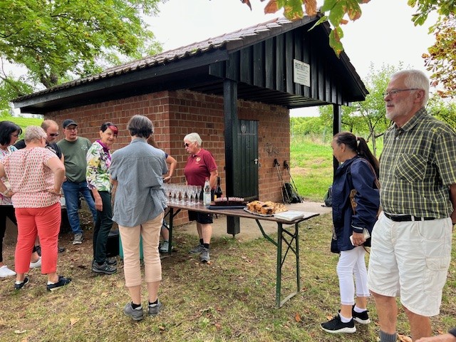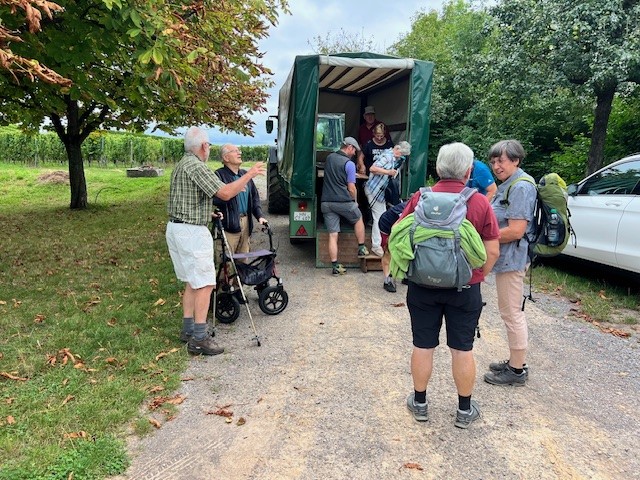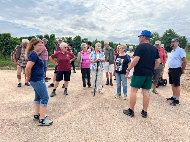 11 Seißemer traffen pünktlich um 10 Uhr vor dem Rathaus Nordheim auf 20 Nordheimer Wanderkameraden und bestiegen unverzüglich den Planwagen Richtung Weinberg im Gewann Rot. Nach leckerem Begrüßungssekt und Kuchen an der Hütte Rot führte uns Weinerlebnisfühererin Maren gekonnt und kenntnisreich über 3 Stationen durch den Weinberg. Jede Station lockte mit Weinverkostung, Käse, Obazdem und Weißbrot und brachte die harte Arbeit im Weinberg, neue Sorten und Pfropfung der Rebstöcke näher. Im Steinle gab es zum Abschluß eine Stärkung mit Wiener Schnitzel und Kartoffelsalat und schon war das jährliche Treffen mit unseren Nordheimer Freunden wieder Geschichte. Danke für eine sehr lehrreiche, tolle Tour! Wir freuen uns, nächstes Jahr die Nordheimer wieder in Seißen begrüssen zu dürfen.