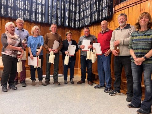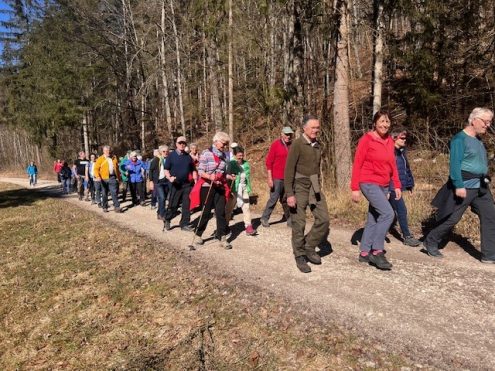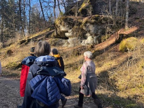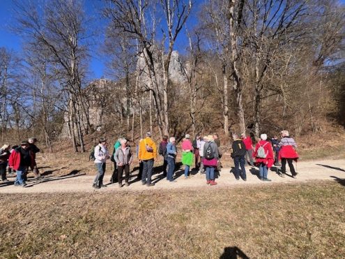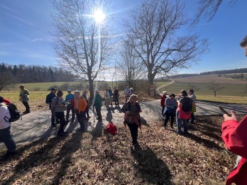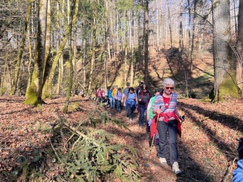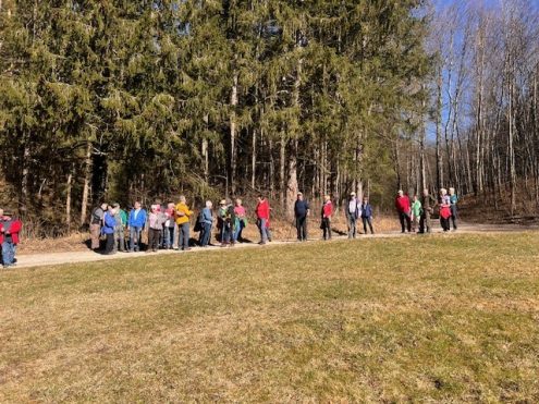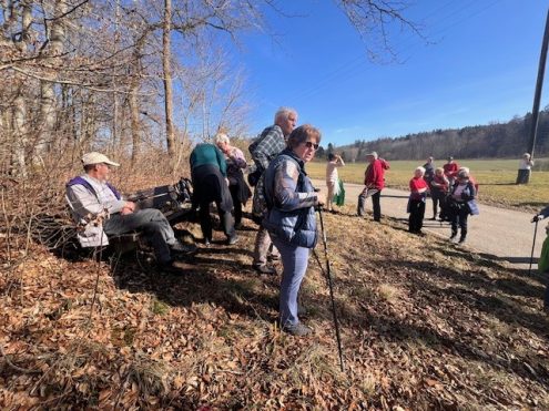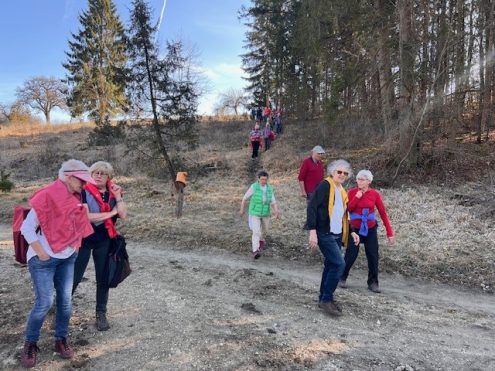 Traditionsgemäß zusammen mit der OG Berghülen lud ein fast frühsommerliches Prachtwetter ein zur Märzenbecherwanderung. Die OG Seißen fühlte sich mengenmäßig ziemlich gut aufgestellt für den anschließend in der Zehntscheuer geplanten Kaffee mit den vorbereiteten viereinhalb Kuchen….und rieb sich dann schwer die Augen, als sie am Parkplatz beim Hundesportverein eintraf — Auto über Auto, voll beladen mit fröhlich bunt gekleideten Wanderern. Nicht nur, dass die OG Berghülen mit 30 strammen Wanderern bereits wartete, nein auch die OG Sontheim wollte genau diese Strecke mit vielen Teilnehmern laufen. Also machten wir uns zu sechundvierzigst auf, die Märzenbecher zu bestaunen. Und wie sie blühten — die Mühen des Aufstieges durch das Schmähental zum Hochsträß hinauf wurden reich belohnt — alle Hänge zeigten ein wahres Meer an blühenden Märzenbechern. Nach einer kurzen, schon zur Tradition gehörenden Lektion zu den Inhaltsstoffen der Frühblüher (Galanthamin, ein Wirkstoff zur Erleichterung mancher Alzheimersymptome) ging es vollends hinauf zu einer süssen und auch mit etwas Schlehen- und Apfelbranntwein leichter verdaulich gemachten kurzen Rast.