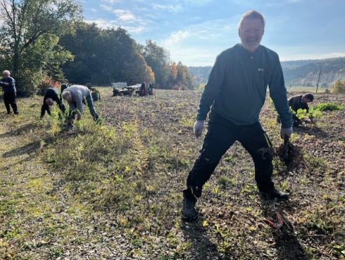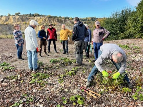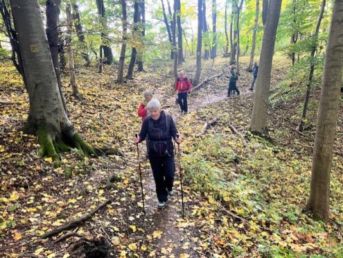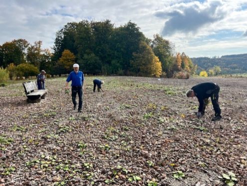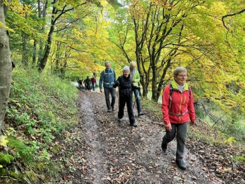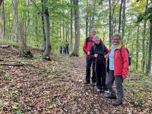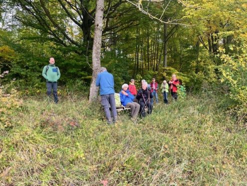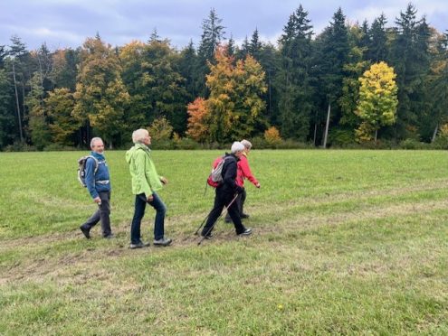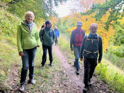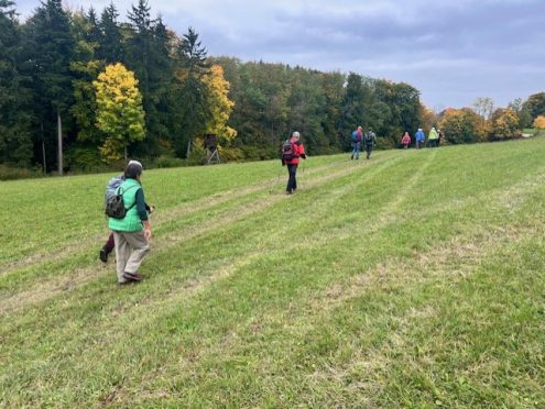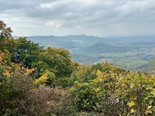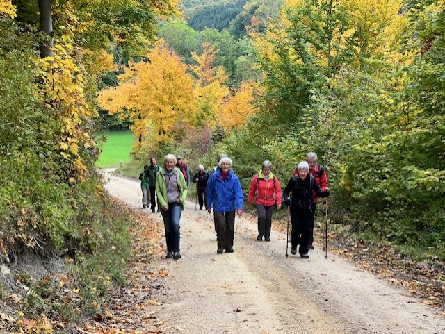 Nach der verdienten Einkehr im Boßler-Haus ging es gut gestärkt 250 Höhenmeter hinunter zum Parkplatz durch herbstbunte Heckenreihen mit Weitblicken ins Filstal.