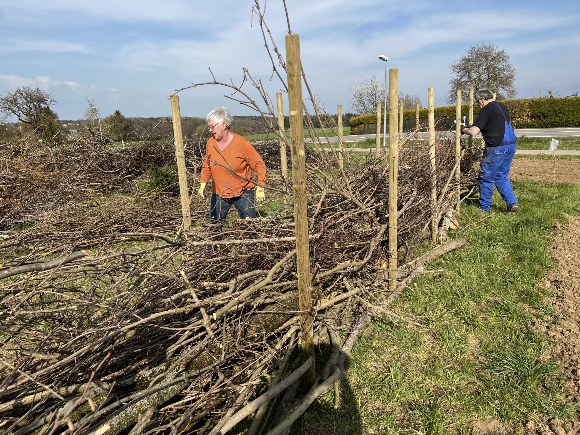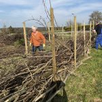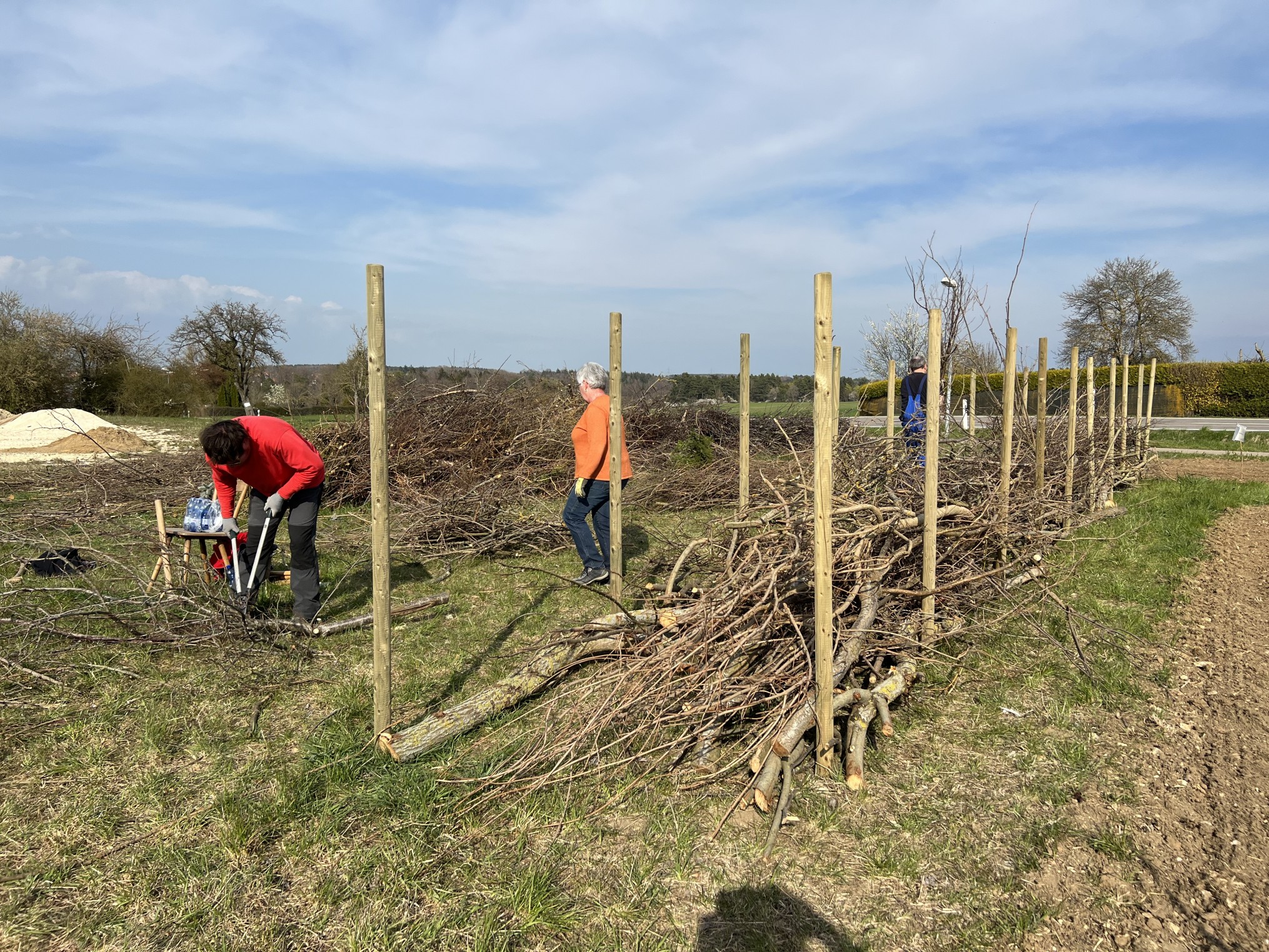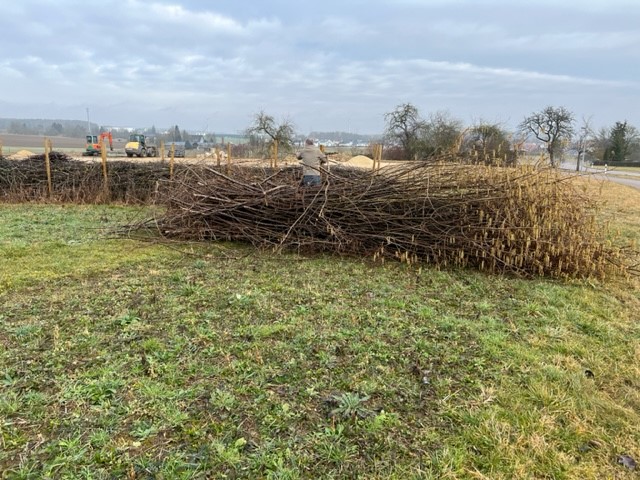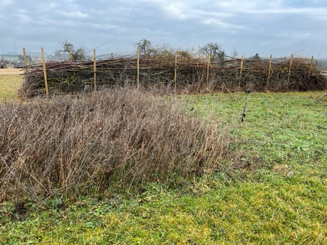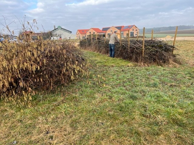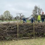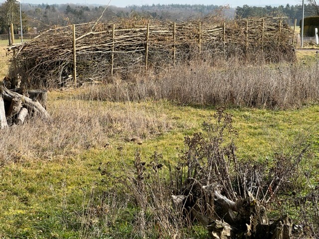 Das letztjährige Schnittholz in der Benjeshecke ist durch Trocknung/Wasserverlust stark geschrumpft, die Hecke ist fast um die Hälfte niedriger als nach der Neuanlage. Da die Benjeshecke auch einen Windschutz vor dem kalten Nordwind bildet, sollte sie wieder die Originalhöhe von ca. 1,80 haben. Ende Februar hat der Bauhof freundlicherweise Schnittholz von Haselnuss und Holunder angefahren, dieses Material schichten wir wieder von oben auf die bestehende Hecke, um Höhe zu gewinnen. Auch wird dadurch neuer Samen in die Hecke eingebracht, der hoffentlich eines Tages keimt und Haselnuss und Holunder wachsen lässt und auf diese Weise eine neue, lebende Hecke bildet.