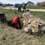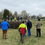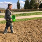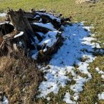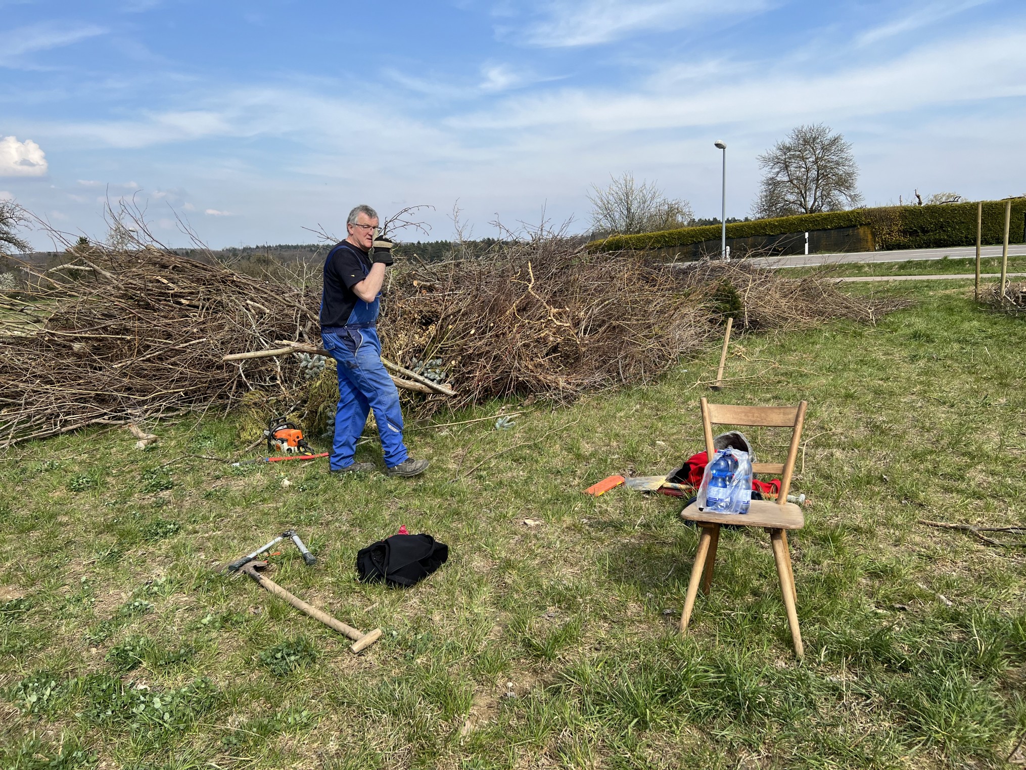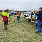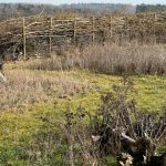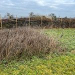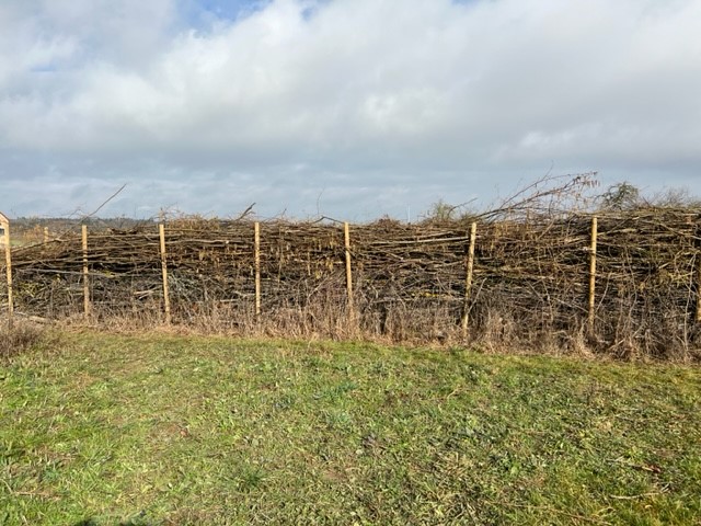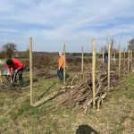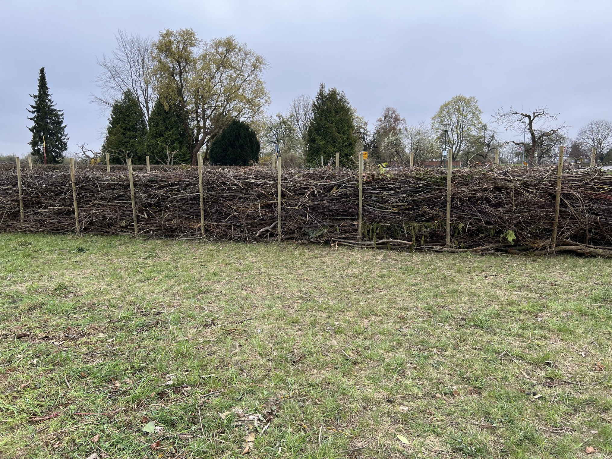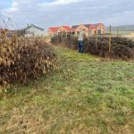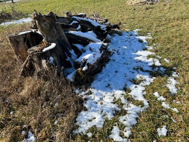 Das letztjährige Schnittholz in der Benjeshecke ist durch Trocknung/Wasserverlust stark geschrumpft, die Hecke ist fast um die Hälfte niedriger als nach der Neuanlage. Da die Benjeshecke auch einen Windschutz vor dem kalten Nordwind bildet, sollte sie wieder die Originalhöhe von ca. 1,80 haben. Ende Februar hat der Bauhof freundlicherweise Schnittholz von Haselnuss und Holunder angefahren, dieses Material schichten wir wieder von oben auf die bestehende Hecke, um Höhe zu gewinnen. Auch wird dadurch neuer Samen in die Hecke eingebracht, der hoffentlich eines Tages keimt und Haselnuss und Holunder wachsen lässt und auf diese Weise eine neue, lebende Hecke bildet.