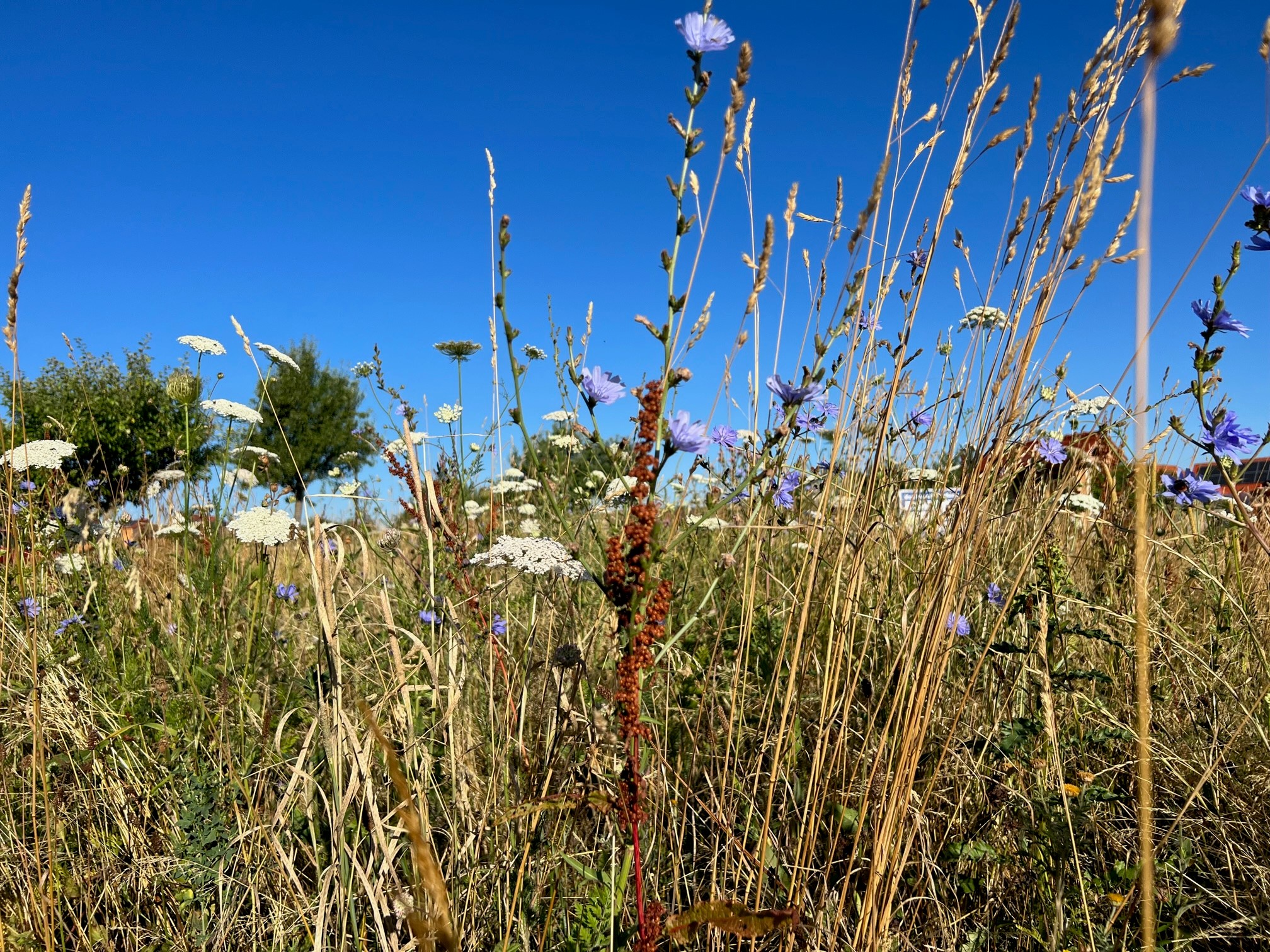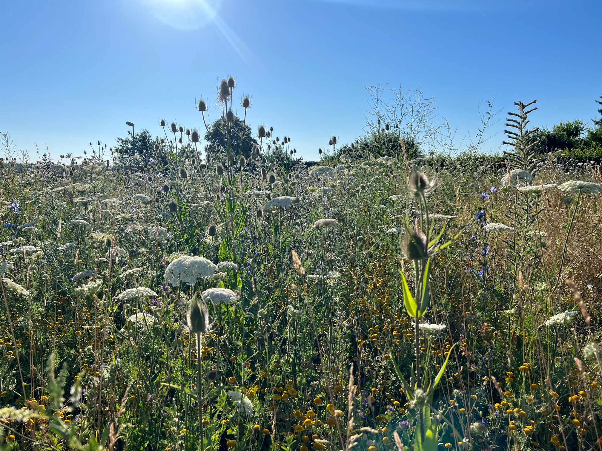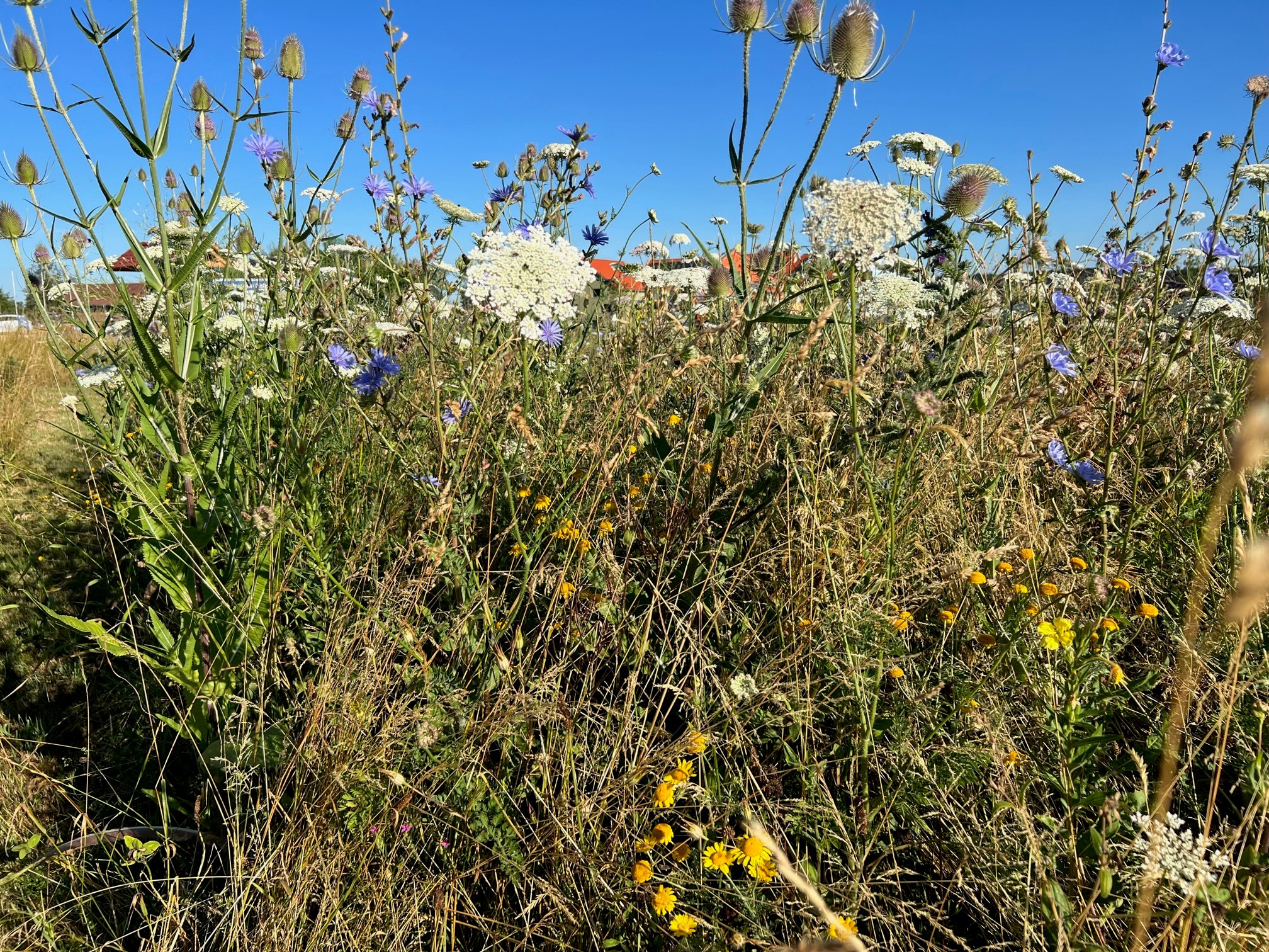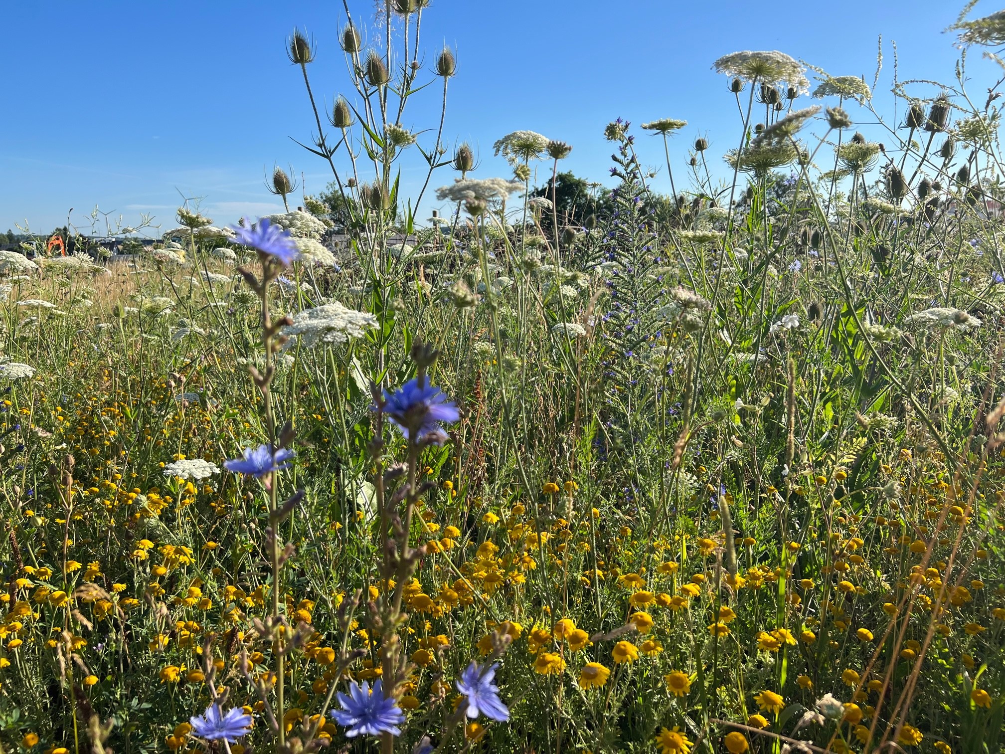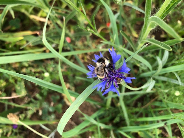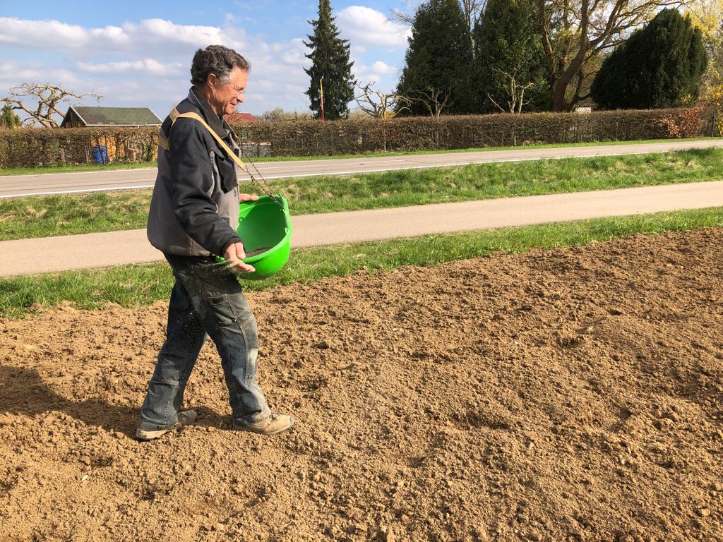 Es summt und brummt auf der Seissener Wildbienenweide. Die mehrjährige Saat ist gut aufgegangen und es blühen Wilde Möhren, weisse und gelbe Kamille, Natternkopf, Mohn, Wegwarte, Phacelia, Karde, Bunte Distel, Labkraut und viele mehr. Die Wildbienen freuen sich und kommen zahlreich vorbei. Nach unserem Sensenkurs bei Heinz Wiedmann können wir nun im Herbst fachgerecht manuell die Mahd vornehmen!