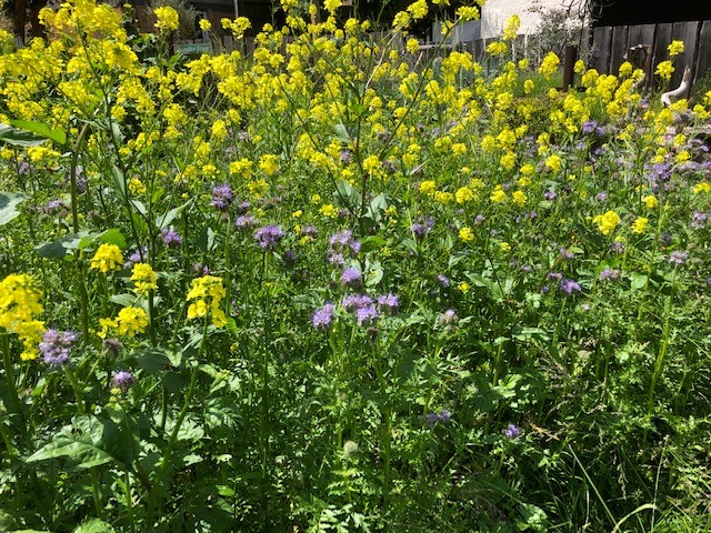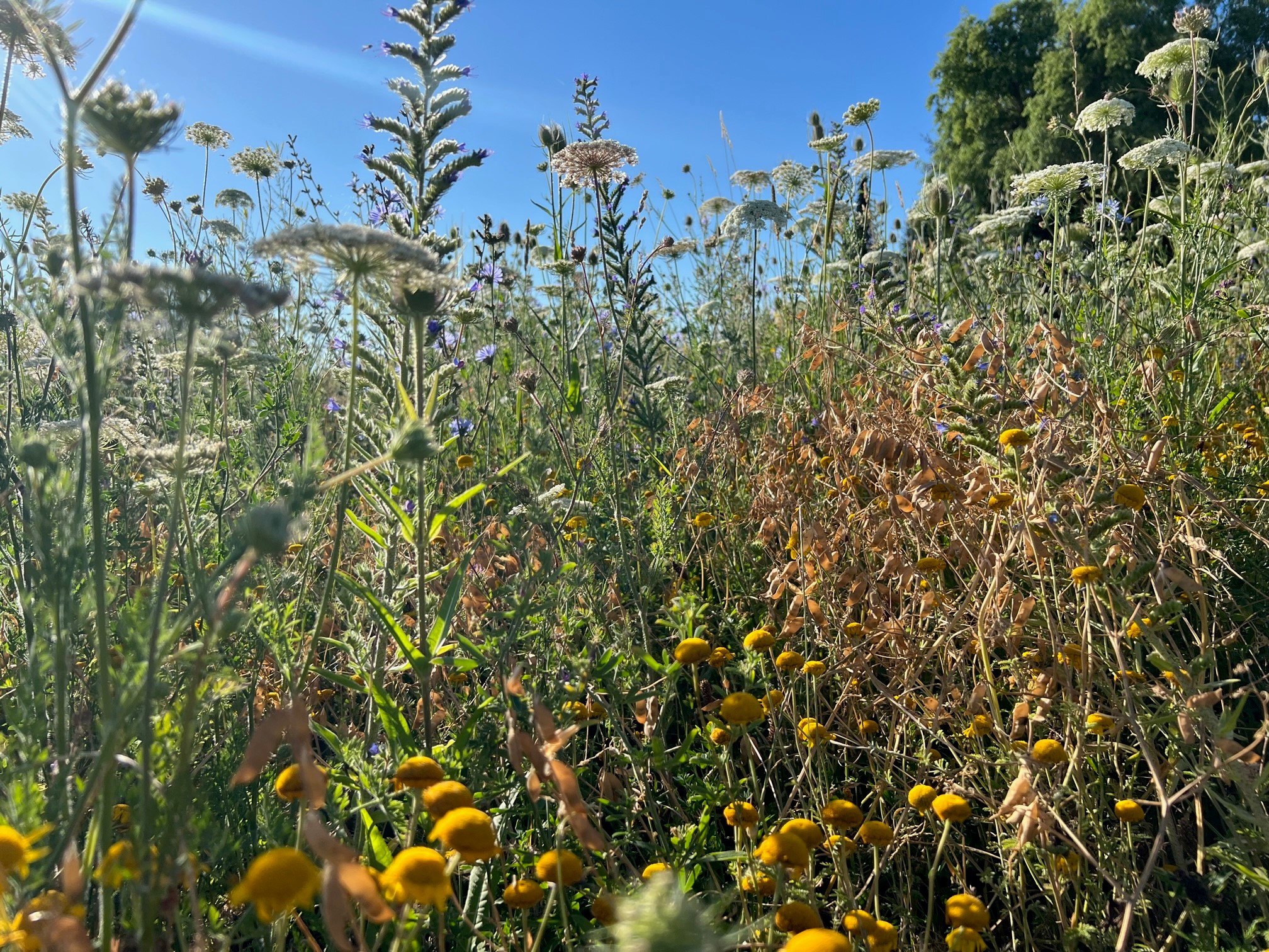 Zuerst waren Phacelia, Ackersenf und Raps stark in der Überhand, nun kommen Mohn, Kamille gelb und weiß, Kornblumen, Ringelblumen, Buchweizen, Labkraut, Schafgarbe und viele weitere Blümchen, sodass der Tisch für die Bienen immer reich gedeckt ist.