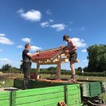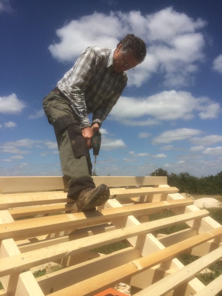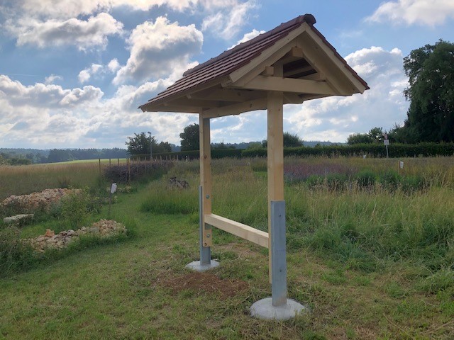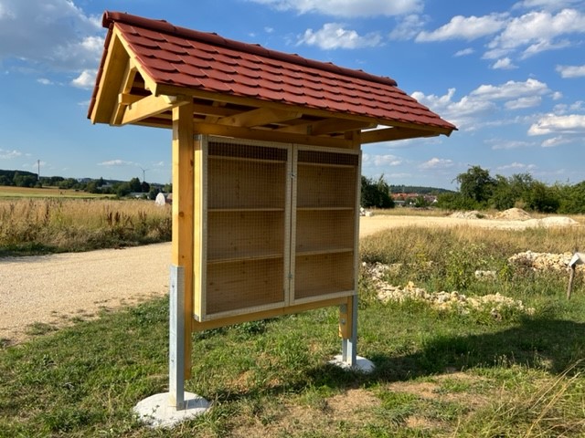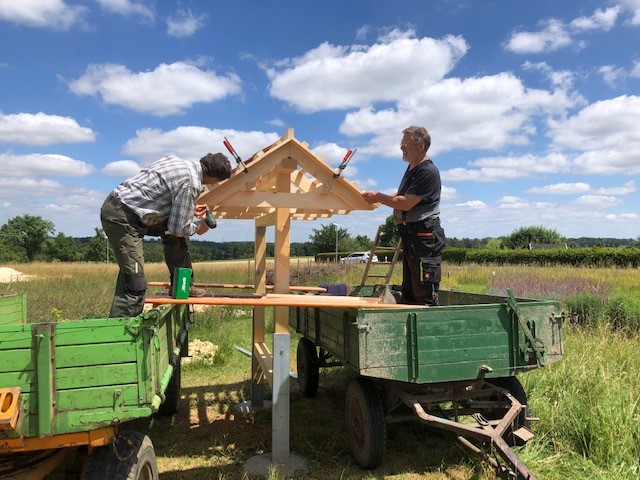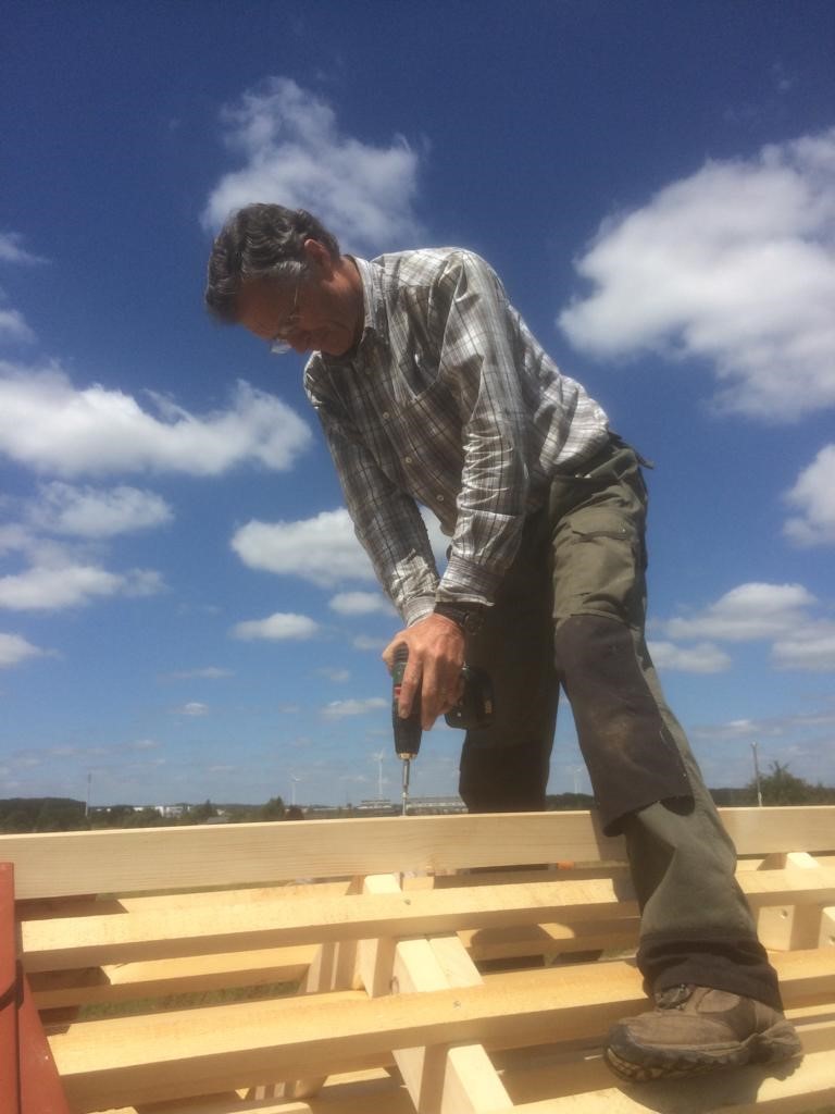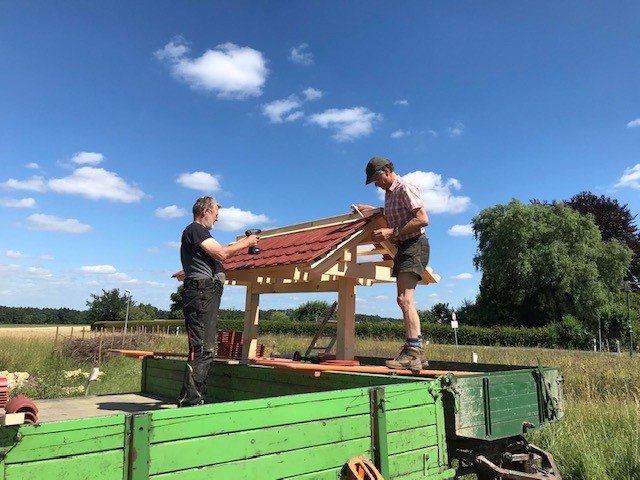 Georg Zeh hat in tagelanger Arbeit das Wildbienenhotel vom Plan des Architekten aufs Reißbrett gebracht (mit ein paar Verbesserungen :-)), die Materialien besorgt und zusammengebaut. Nachdem die Löcher fürs Ständerfundament von zwei weiteren fleissigen Helfern, Thomas und Jochen, ausgegraben waren, konnte Jörg den Rahmen einbetonieren und somit für einen festen Stand bei Wind und Wetter sorgen. Als nächstes wurde das Dach errichtet und gedeckt. Absolut professionell, es gab noch nie ein schöneres Wildbienenhotel.