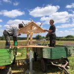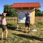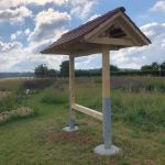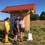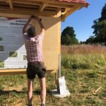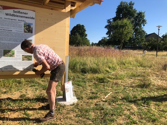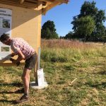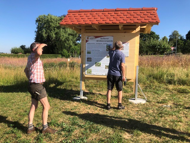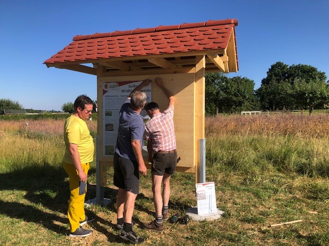 Heute haben Jörg und seine Helfer Thomas und Jochen die Erklärschilder zum Wildbienenprojekt sowie eine Prospektbox am WiBi-Hotel-Rahmen angebracht. Alles natürlich super stabil, damit die heftigen Seißener Herbststürme dem Ganzen auch nichts anhaben können. Und wie es sich für einen echten Zimmerer gehört, ist auch alles exakt und absolut im Wasser!