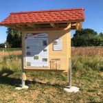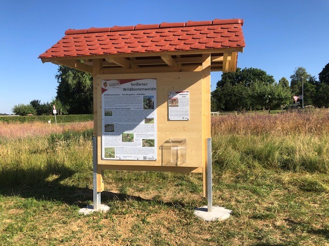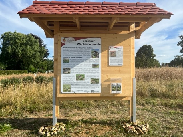 Die Erklärschilder weisen jeweils mit Foto auf die einzelnen Elemente der Wildbienenweide hin, zB. Sandarium, Totholzhecke, Lesesteinmauer, Stauden, Blühwiesen, Totholzhaufen etc und machen die Funktion der Elemente deutlich.