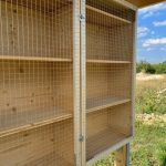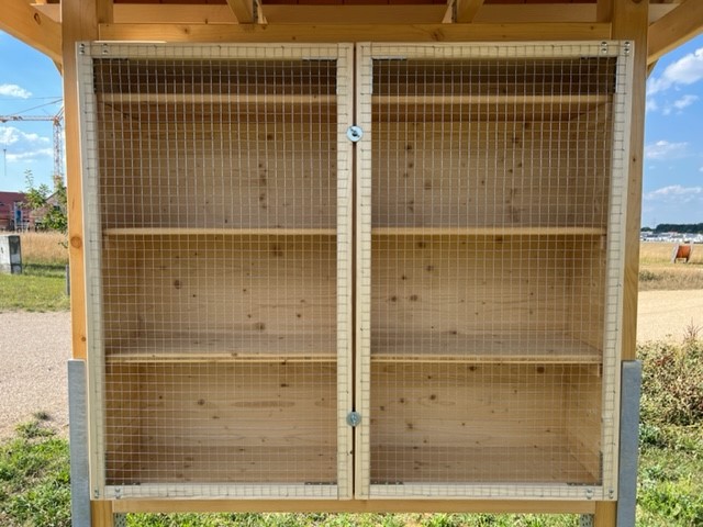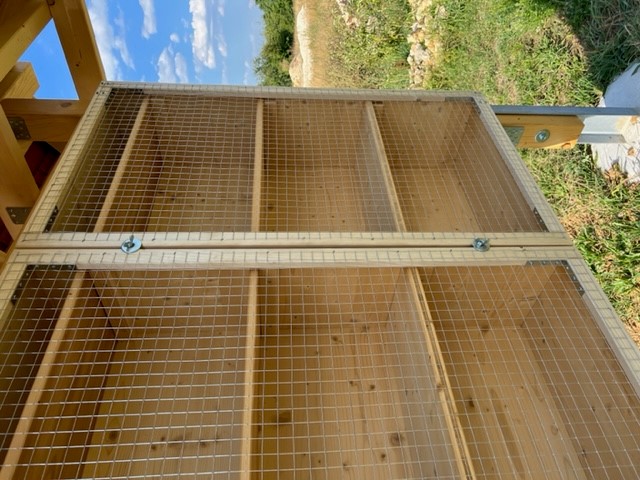 Jörg war wieder in action — er hat das Vogelschutzgitter angebracht. Eine Maschenweite von 1.8 cm – 2.0 cm ist ausreichend, damit die Bienen problemlos rein und rausfliegen können. Der Abstand zu den Brut-Löchern sollte mindestens 4 cm sein.