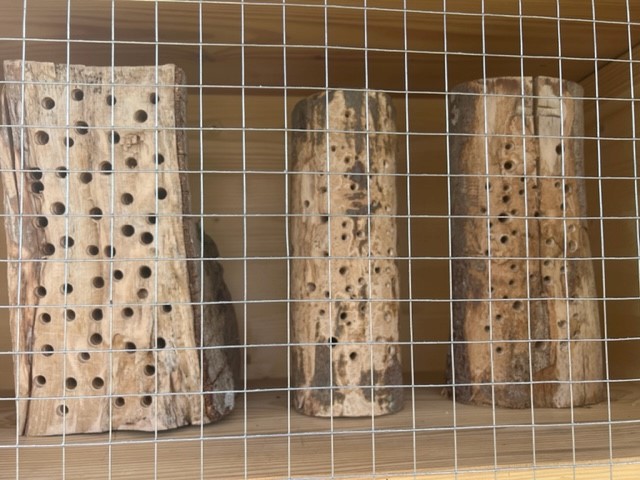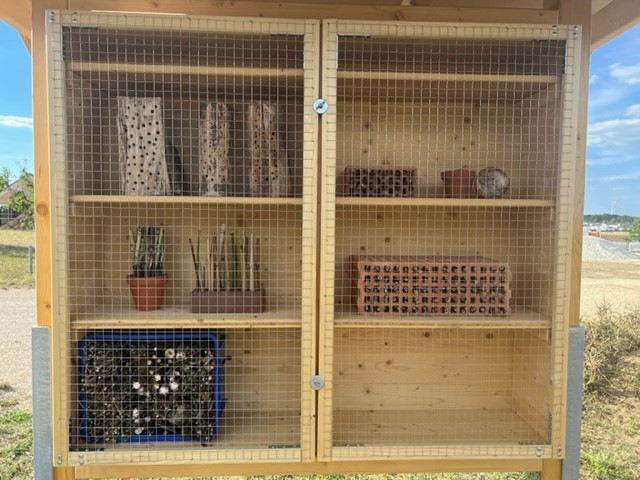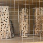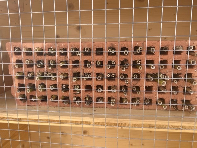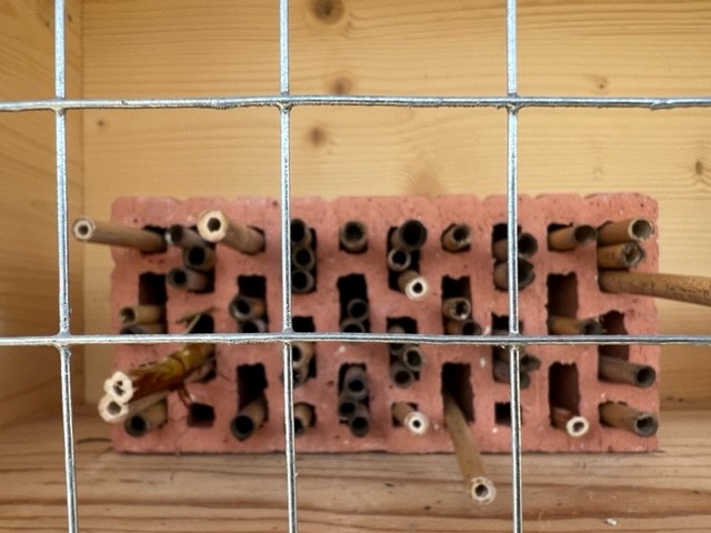 Im Wildbienenhotel sind ganz deutlich die Verschlüsse der Brutröhren der Wildbienen in den Bohrungen der Nisthilfen zu sehen, auch die Hohlstengel wurden gut als Quartier für die neue Brut angenommen. Der Standort scheint also gut angekommen zu sein!