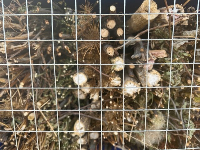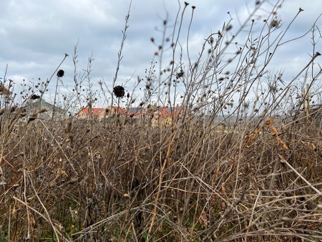 Die absterbenden Pflanzen auf der Wildbienenweide werden zum Teil stehen gelassen, da auch hier die Insekten ihre Eier in die senkrechten Hohlstrukturen abgelegt haben. Speziell die Karden sind zu nennen, die vielen Insekten mit ihrem breiten hohlen Stengel Raum zur Eiablage bieten. Diese Pflanzenreste werden bis Ende April des kommenden Jahres stehen gelassen, um ein Schlüpfen der jungen Wildbienen im Frühling zu ermöglichen.
