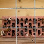 - In die Hohlstruktur von Ziegeln wurden gefüllte und ungefüllte Halme unterschiedlichen Durchmessers ( 3 – 10 mm) und Länge ( 15 – 20 cm) aus verschiedenen Pflanzenarten horizontal und vertikal gesteckt, wobei auf waagrechte bzw senkrechte Ausrichtung geachtet wurde, da die Bienen keine schiefen/schrägen Strukturen für Brutröhren nutzen. Es wurde Karde, Bambus, Felddistel, Ackerbohne, Berberitze und Kerbel verwendet. Die Ziegel erwärmen sich im Winter durch die einfallende Sonne und geben in den kalten Nächten die Wärme an die Bienenbrut ab. Die Hohlstruktur der Ziegel selbst sollte nicht als Brutröhre dienen, da der Durchmesser zu groß und die Eingangskanten zu scharf für die Bienenflügel sind.