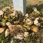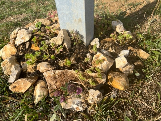 Zusätzlich wurden die nackten Betonplatten des Ständerfundaments mit Lesesteinen und magerer Erde versehen und mit Sedum und Sempervivum bepflanzt — nicht nur aus optischen Gründen. Auch die Pollen von Sedum- und Sempervivum-Blüten sind beliebtes Wildbienenfutter.