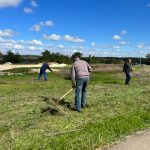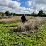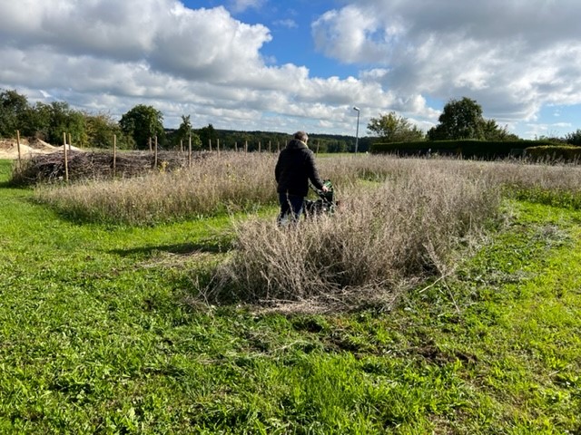 Ende September/Anfang Oktober wird die Wildbienenweide mit einem Balkenmäher gemäht, ein Rest von etwa 25 % der Fläche bleibt bis zum Frühjahr stehen. Der Balkenmäher wird verwendet, um so schonend wie möglich zu mähen und nicht die Kleinstlebewesen in Bodennähe zu schreddern.