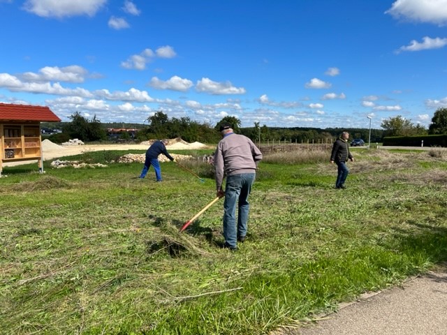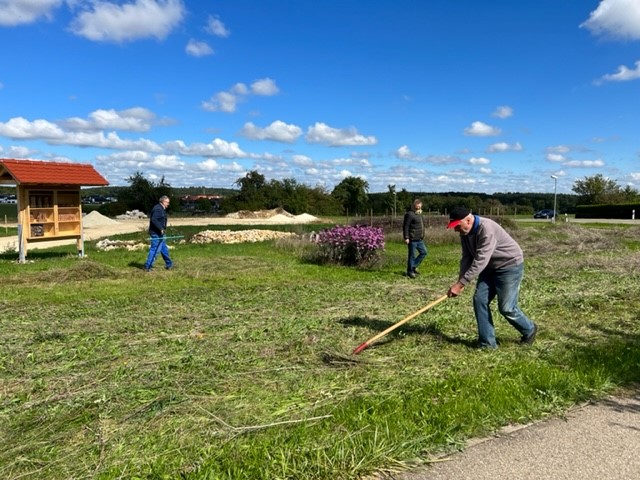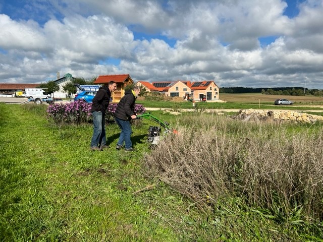 Bei wunderschönem Wetter Ende September bekamen wir von Roland Frick vom BUND Blaubeuren eine Einweisung in den neuen Balkenmäher vom BUND Blaubeuren, einem tollen Gerät mit viel Power. Dank Rolands Geduld mit uns zwei Anfängern gelang es uns in ca. 30 Minuten, 75 % der Wildbienenweide optisch ziiiemlich ordentlich zu mähen. Und nachmittags gesellten sich dann mehrere fleissige Helfer zum Abraum der Mahd dazu. Nach 4 Hängerladungen Abraum ist die Wildbienenweide perfekt für den Winter und die neue Auskeimung im nächsten Frühjahr vorbereitet.